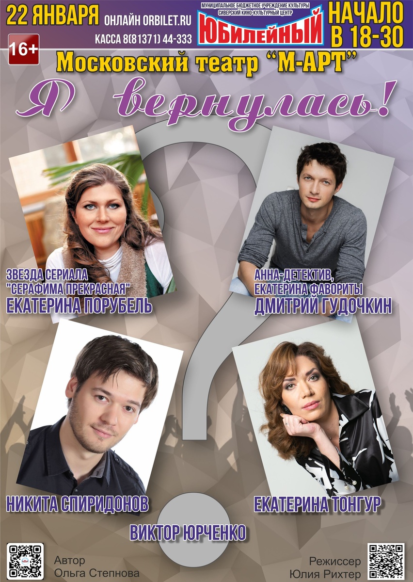 🎭 УЖЕ ЗАВТРА!!!!!ТОРОПИТЕСЬ ЗА БИЛЕТАМИ!!!!! Московский театр "М-АРТ" приглашает жителей и гостей города на грандиозную комедию по пьесе Ольги Степновой "Я вернулась" ✨В главных ролях: звезда сериала "Серафима Прекрасная", актриса Малого театра, лауреат премии "ТЭФИ" ЕКАТЕРИНА ПОРУБЕЛЬ и звезда сериалов "Анна-детектив", "Екатерина.Фавориты" и др актер Вахтанговского театра ДМИТРИЙ ГУДОЧКИН. И артисты Московского драматического театра "Сфера" ⏰Спектакль состоится УЖЕ ЗАВТРА 22 января в 18-30 в ДК "Юбилейный" ☎Справки и заказ билетов по телефону: 8(81371) 44-333 Билеты в кассе дворца культуры или онлайн на сайте orbilet.ru/event/16243 Торопитесь за билетами и вы получите массу положительных эмоций и хорошего настроения.Мы ждем вас. Наш канал в Max, вступайте Источник: Открыть