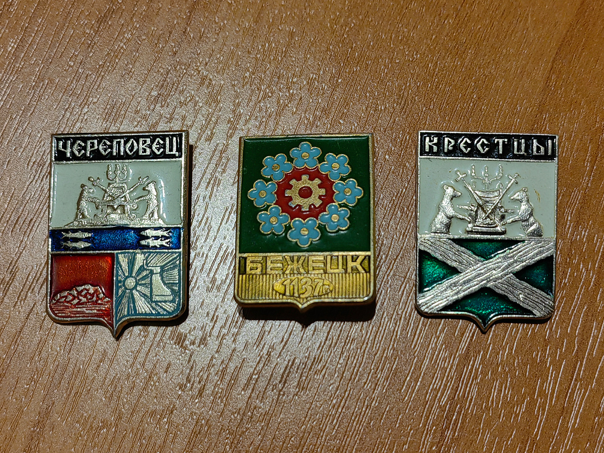 Третья по счёту фото-распаковка советских значков, которые я начал недавно покупать, чтобы создать тематическую коллекцию, идею которой пока точно не сформулировал. Но разделы уже имеются. Например, города России, В.И. Ленин, движение октябрят, Ленинград и другие. Все публикации буду сохранять здесь. В этот раз значки мне прислал продавец-коллекционер из Мурманска. Посылка шла всего 3 дня. Изначально я хотел купить значок "Бежецк", потому что пару дней назад поехать в этот город, но решил у продавца купить и несколько других, чтобы, во-первых, превысить сумму доставки (200 рублей, а значки стоят рублей по 40 каждый) и, во-вторых, пополнить тематические разделы. 1. Три значка с гербами городов России, где я был Интересна история рисунка на значке г. Бежецка. В советский период исторический герб Бежецка (от 1780 года) не использовался, но выпускались сувенирные значки с изображением нового проекта герба Бежецка, который так и не стал официальным. Выглядел он следующим образом: на зелёном