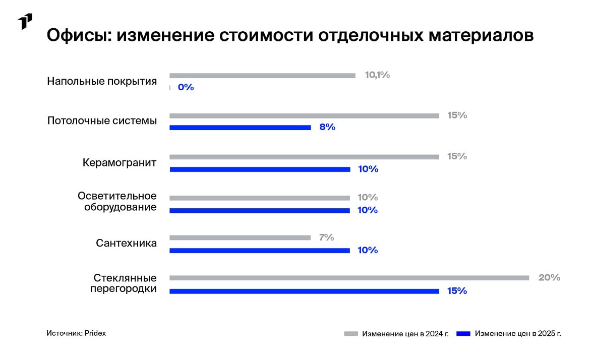 В сочетании с общим охлаждением спроса на рынке недвижимости и, как следствие, снижением загрузки производств это привело к замедлению роста цен на основную часть материалов и оборудования для строительства офисов.