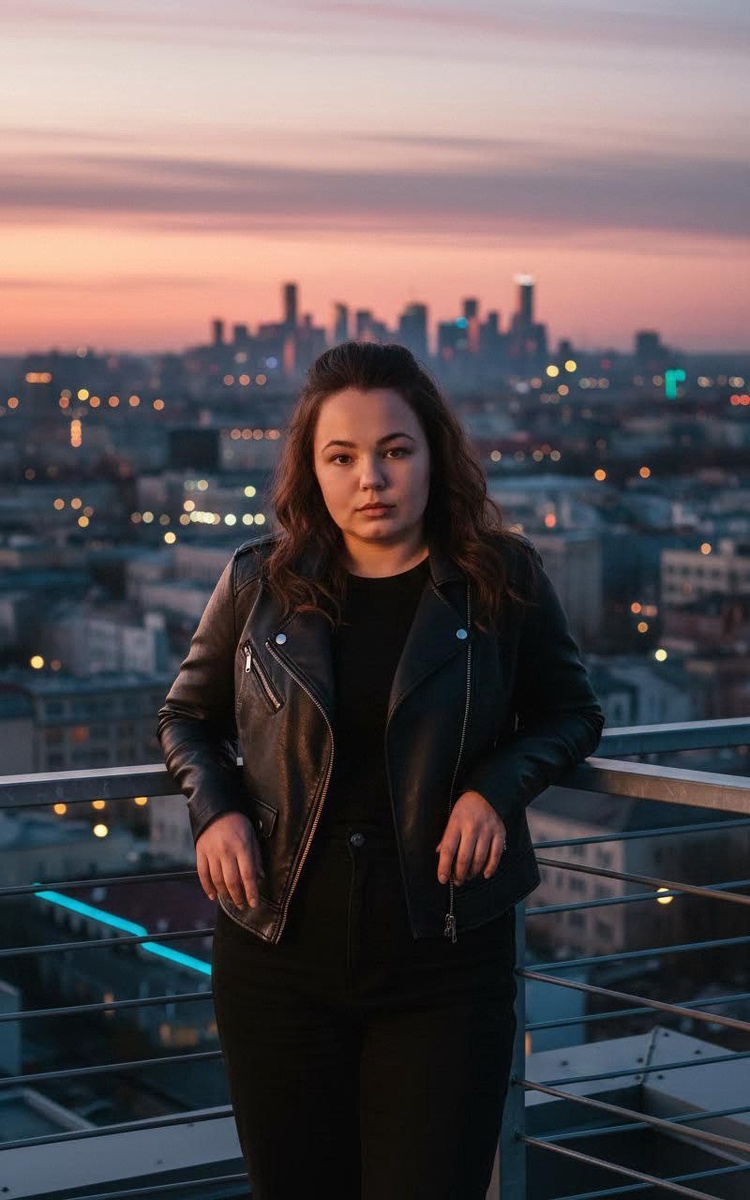 Прическа - распущенные, волнистые волосы.Она одета в облегающую кожаную куртку в сочетании с брюками с высокой талией, небрежно опираясь на перила. Мягкие розовые и фиолетовые оттенки сумерек смешиваются с прохладными неоновыми акцентами, придавая фотографии настроенческую, но современную атмосферу.