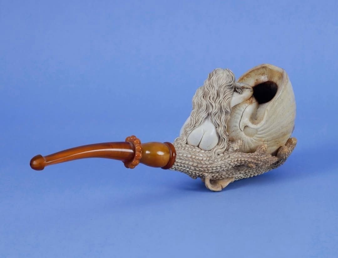 Большая трубка с оригинальным янтарным чубуком, вырезанным в виде русалки, обнимающей чашу из раковины Наутилуса