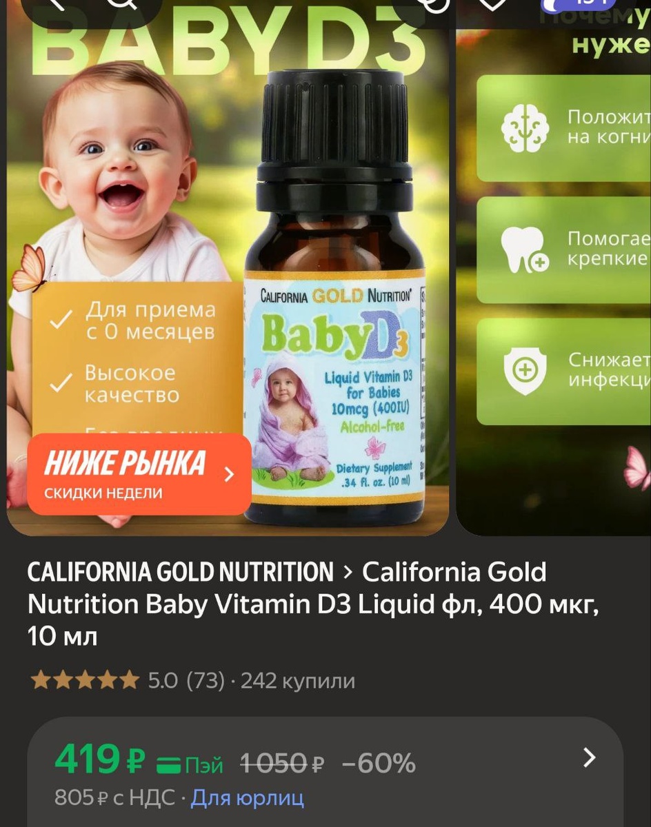 π»California Gold Nutrition Baby Vitamin D3 Liquid ΡΠ», 400 ΠΌΠΊΠ³, 10 ΠΌΠ» - 419Ρ (Ρ.ΠΏΡΠΉ