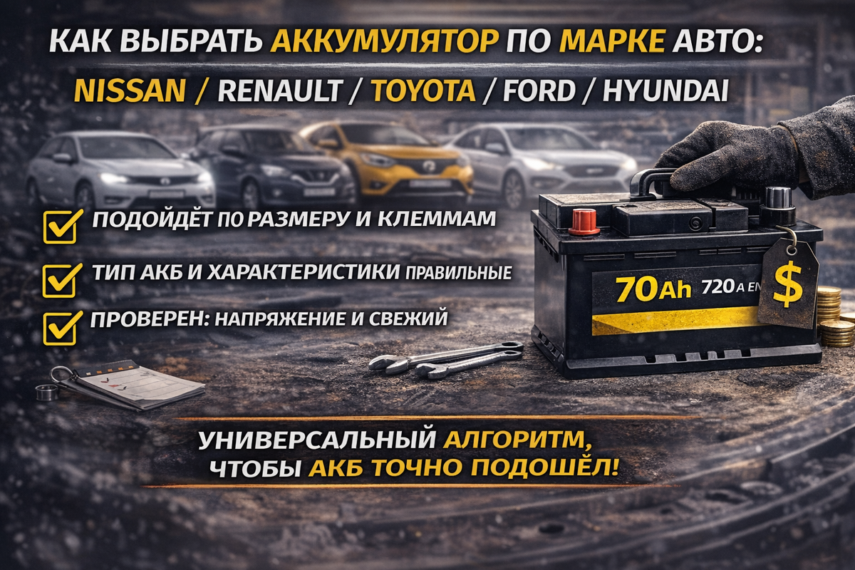 Я — POWER LAB. Сейчас дам универсальный алгоритм, который работает для Nissan / Renault / Toyota / Ford / Hyundai и вообще почти для любой машины: как понять, какой нужен аккумулятор, чтобы он реально подошёл и жил нормально.