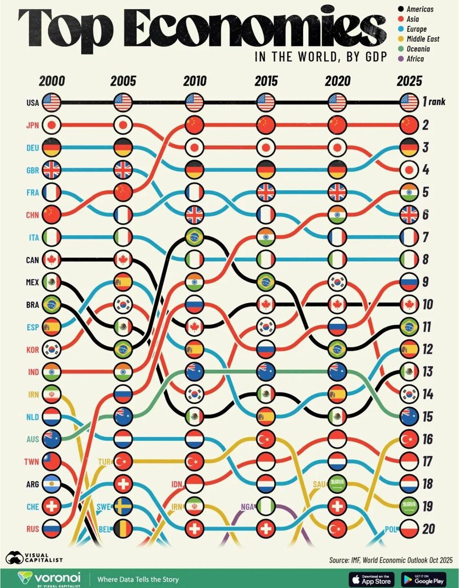 Глобальный ВВП за все этой время вырос почти в три раза. Но рост был неравномерным: одни экономики ускорялись, другие фактически стояли на месте. Карта мира изменилась не визуально, а экономически. 🌸Что произошло с лидерами? США сохранил первое место. Китай - главный сдвиг эпохи: из середины списка в устойчивый топ-2. Индия - самый быстрый рост среди крупных экономик. Япония и Европа - долгий период слабой динамики без рывков. Россия прошла цикл «рост → спад → восстановление». Если смотреть не на колебания, а на итог, страна удержалась в числе крупнейших экономик мира и вернулась в топ-10 по размеру ВВП. В экономике, как и в поиске, универсальные связки больше не дают профита. Нужно понимать, где рост органический, а где — временный памп. 🌸Именно для этого мы собрали папку топовых каналов по бизнесу и маркетингу: - истории компаний и предпринимателей, - тренды маркетинга и инсайты рынка, - разборы ошибок и побед, - полезные материалы для роста. Добавьте себе ▶️ https://t.me/addl