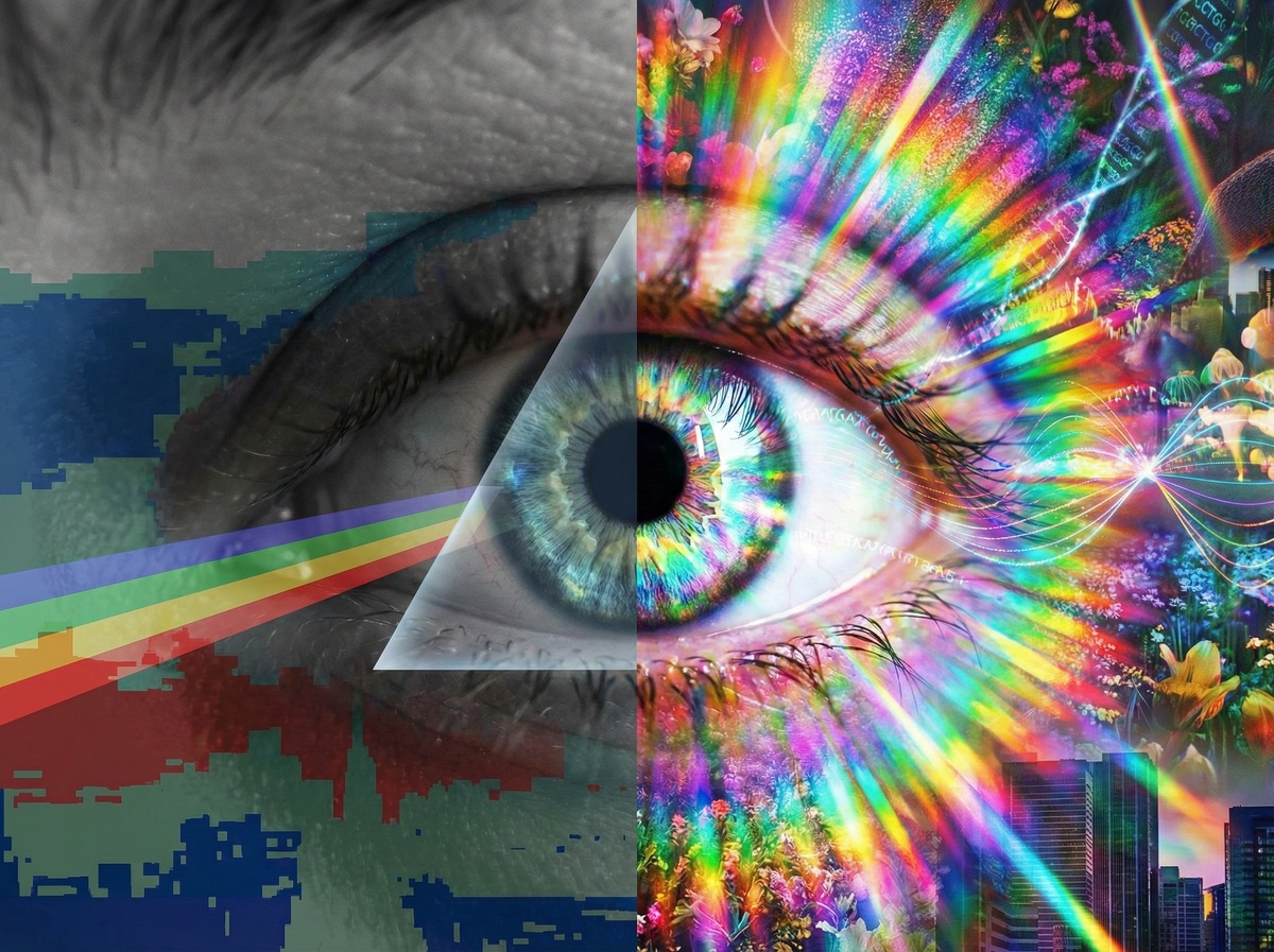 А что, если твой мир - блеклая версия реальности? Не плохая, не неправильная. Просто урезанная. Как старая фотография, где цвета вроде есть, но чего-то не хватает. И ты об этом даже не догадываешься. Потому что сравнивать не с чем. Есть люди, для которых радуга - не семь цветов и даже не сотни оттенков. А миллионы. До ста миллионов, по примерным данным. И это не метафора, не поэтическое преувеличение. Это феномен, который называется тетрахроматия. Звучит почти как название болезни. Но на самом деле - редкая генетическая особенность. Или, если угодно, скрытая суперспособность. Человеческий глаз в норме работает с тремя типами колбочек - клеток, отвечающих за восприятие цвета. Красный, зелёный, синий. Три канала. Из их комбинаций мозг собирает всю цветовую картину мира. Миллионы оттенков, да. Но есть нюанс. Дополнительный тип колбочек позволяет различать оттенки, которые для остальных просто сливаются. Там, где ты видишь «примерно бежевый», они видят десятки вариаций: тёплый, холодный, п