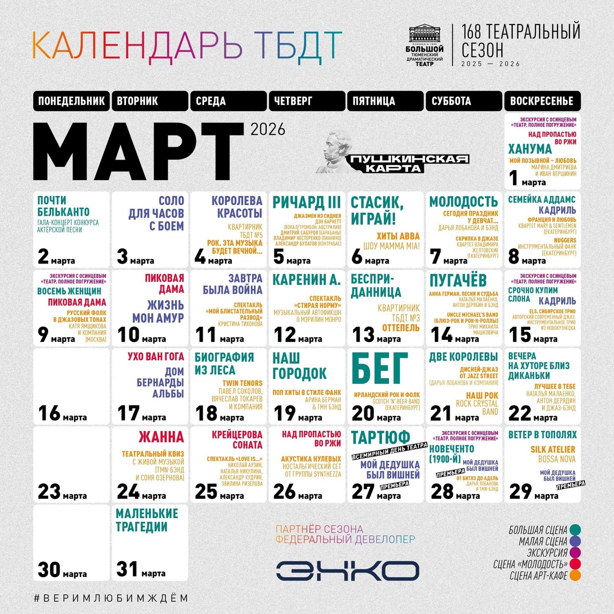 🎶 Готовьтесь к весне вместе с театром! В марте уже в продаже новый репертуар, который поможет растопить зимнее настроение и наполнить дни яркими эмоциями. ⭐ Планируйте культурную программу заранее, чтобы не пропустить интересные постановки и получить максимум удовольствия от весенних вечеров. 🎫 Билеты доступны в онлайн-кассе театра — удобный способ выбрать и купить билет заранее. Билеты онлайн: https://tdt.kto72.ru Источник: Тюменский Большой Драматический Театр #Тюмень #tyumen #tmn #tymen