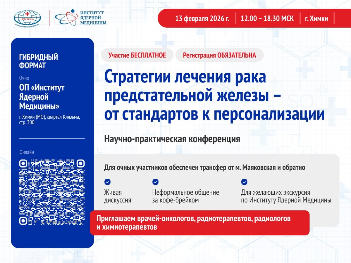 Приглашаем Вас на научно-практическую конференцию «Стратегии лечения рака предстательной железы – от стандартов к персонализации» 📅 Когда: 13 февраля 2026 года ⏰ Время: 12.00 – 18.30 💻 Формат: очно/онлайн Место проведения: ОП «Институт Ядерной Медицины», г. Химки, квартал Клязьма, стр. 300 Для очных участников обеспечен трансфер от м. Маяковская и обратно В программе семинара • «Лучевая диагностика рака предстательной железы: возможности и практическое применение" Мищенко Андрей Владимирович, д.м.н., доцент, главный врач ОП «Институт Ядерной Медицины» Химки, АО «Медицина». • «Повышение эффективности радиотерапии: персонализированное лечение рака предстательной железы на основе новых технологий визуализации» Кирюшкина Диана Тимофеевна, старший медицинский физик отделения радиотерапии ОП «Институт Ядерной Медицины» Химки, АО «Медицина». • «Сочетанная лучевая терапия при раке предстательной железы» Макарова Ксения Сергеевна, врач-радиотерапевт отделения радиотерапии МРНЦ им. А.Ф. Цыба