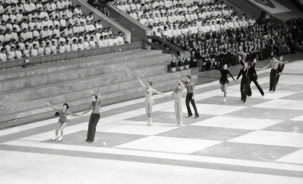Конькобежцы в крытом зале: тренировка как строевая (Кировская область, 1960)
