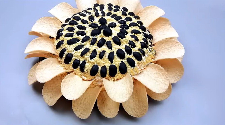 Здравствуйте,друзья!Сегодня готовим Шикарный Салат Подсолнух На Праздничный Стол!Покорит красотой и вкусом/Салат С Курицей,Грибами/Простой рецепт. Оригинальная подача в виде цветка надолго запомнится всем гостям Для этого рецепта нам понадобится :Шампиньоны, промойте,обсушите и нарежьте тонкими пластинками Луковицу нарежьте мелкими кубиками В конце грибы посолите и поперчите. Дадим остыть Куриное филе очистите от кожи и костей и нарежьте небольшими кубиками Яйца отварите вкрутую,отделите белки от желтков. Яйца натрите на средней терке, по отдельности Сыр натрите на крупной терке. Понадобится примерно банка маслин без косточек.Маслины разрежьте вдоль пополам. На круглую тарелку выложите курицу, разровняйте и смажьте майонезом Поверх курицы распределите жареные грибы с луком Следующим слоем выложите яичные белки и промажьте их майонезом. Равномерно посыпьте салат яичными желтками. Уложите маслины Поставьте салат на 2 часа в холодильник для пропитки. Чипсы нужны по типу Pringles или Lay