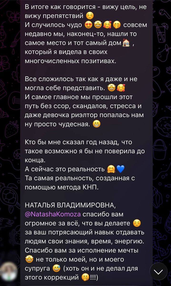 🔥 В свой рост, в своё развитие, в своё будущее, потому что потом эти вложения окупаются многократно💯. И многие, кто приходит учиться в нашу школу, честно говорят, что найти деньги на обучение было непросто. Но потом никто об этом не жалеет, потому что получают они намного больше: новые возможности, новые состояния и ту внутреннюю силу, которую невозможно купить никакими другими способами. Недавно ученица нашей школы поделилась в клубе своей огромной радостью, а также прислала мне отдельное личное сообщение со словами благодарности за исполнение её мечты (её отзыв с результатами от нейрокоррекций вы можете увидеть ниже👇). И это такое счастье — видеть, как люди покупают квартиры🏡, машины🚗, когда у них растут доходы💰, появляются путешествия✈️, комфорт, стабильность, радость — всё то, что делает жизнь легче и ярче💥. И я с уверенностью могу сказать, что так может каждый, ведь всё это результат настроек нашего мозга. Когда мозг перестаёт сопротивляться и начинает помогать, мечты