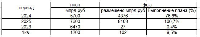 Как финансируют дефицит бюджета В начале 2026г и спрос, и предложение на аукционах ОФЗ низкие. сегодня Минфин разместил ОФЗ только на 65,9 млрд руб. Дефицит бюджета финансируют через эмиссию ОФЗ Минфин проводит аукционы по средам Поэтому спрос и предложение — это важный индикатор В 1-3 кварталах 2025г в среднем в неделю Минфин размещал на 100 млрд рублей, в 4 квартале в 2 раза больше Думаю, пока еще не «раскачались», не пришли в себя после НГ праздников. Также, в связи с падением RGBI, участники рынка хотят выше доходность, но Минфин пока не готов увеличивать доходность ОФЗ Когда будут проблемы с бюджетом, Минфин может использовать скрытые резервы: флоатеры (29 серия). В 2025г Минфин предлагал флоатеры только 1 раз: 12 ноября, спрос был более 3 трлн руб.