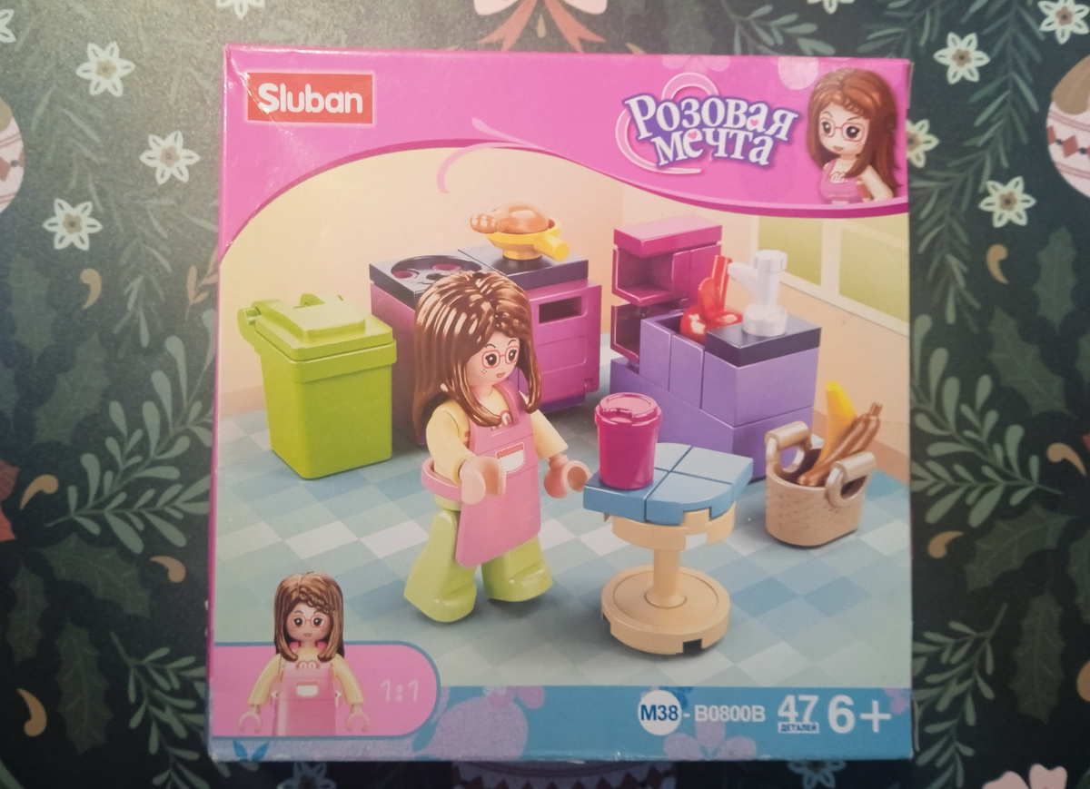 Всем привет. Введу на канале рубрику "Конструкторы". Дело в том, что мне самой нравится их собирать (медитативное занятие вроде вышивания) и часто покупаю детям. В моём детстве у нас с братом был только металлический конструктор для уроков труда, но я не особенно любила его собирать. Потом бабушка прислала нам с Сахалина в подарок на Новый год большой конструктор - оригинальный "Лего": двухэтажный дом, сад и фигурки. Сначала его собирал папа, пока не наигрался. 😂 А потом мама унесла в школу - она работала учителем черчения, и из нашего конструктора на уроках собирали фигуры, по которым потом чертили три вида. 😄 Вот, собственно, и всё. Видимо, теперь я пытаюсь наверстать упущенное, периодически скупая понравившиеся конструкторы, - благо их сейчас большое разнообразие. В этом материале расскажу о конструкторе "Sluban" из серии "Розовая мечта" - "Кухня" (M38-B0800B). 47 деталей, возрастное ограничение - от 6 лет. На коробке изображены предметы, которые нужно собрать. Нарисована героиня.