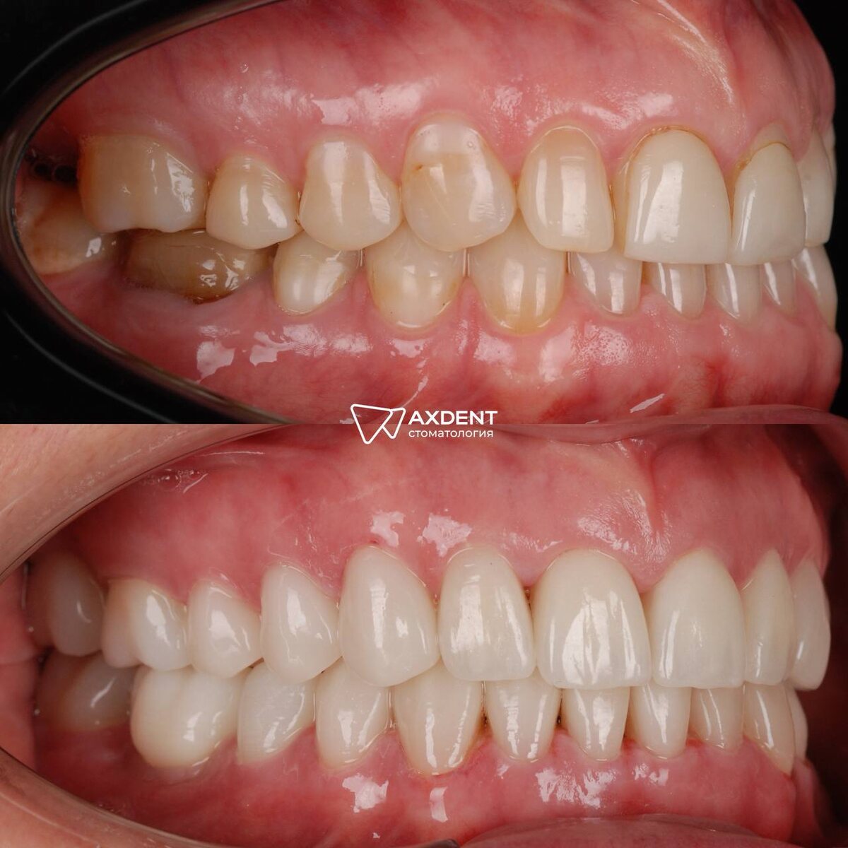 Эта история требует, чтобы о ней рассказали с финала. Наша пациентка получает улыбку мечты и делится радостью со знакомым. Он удивлен. Начинали они путь преображения одновременно, у обоих было тотальное протезирование керамикой. С той лишь разницей, что девушка пришла к нам, а друг пошел своим путем, обратился к их общему старому знакомому стоматологу Улыбка мужчины выглядит хорошо, но привыкает он к ней уже полгода и предпосылок, что когда-нибудь привыкнет, пока нет. В чем же причина? Архитектура зубных рядов - дело тонкое. Основанное далеко не на симпатичной визуальной составляющей, а на правильности выведенной окклюзии. Это в первую очередь. То есть еще до протезирования мы выстраиваем будущее положение зубных рядов, чего оказался лишен товарищ нашей пациентки. А с ней мы пошли именно таким путем. Провели терапию и отдали нашим прекрасным ортодонтам. Специалист проанализировал функцию ВНЧС и спланировал сплинт-терапию, чтобы привести сустав в правильное положение. Далее была проведе