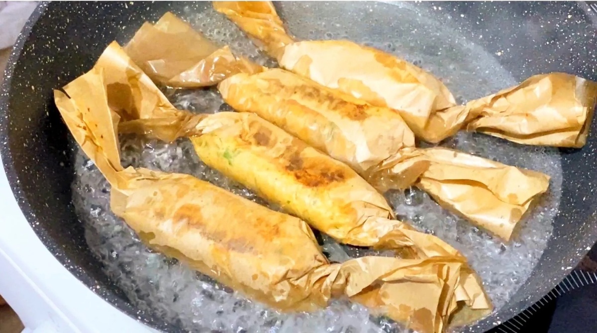 Выкладываем на него фарш и формируем плоскую лепёшку или продолговатую котлету. Плотно заворачиваем фарш в бумагу, как конфету или конверт, чтобы соки не вытекали. Выкладываем на сухую, хорошо разогретую сковороду прямо в бумаге.
