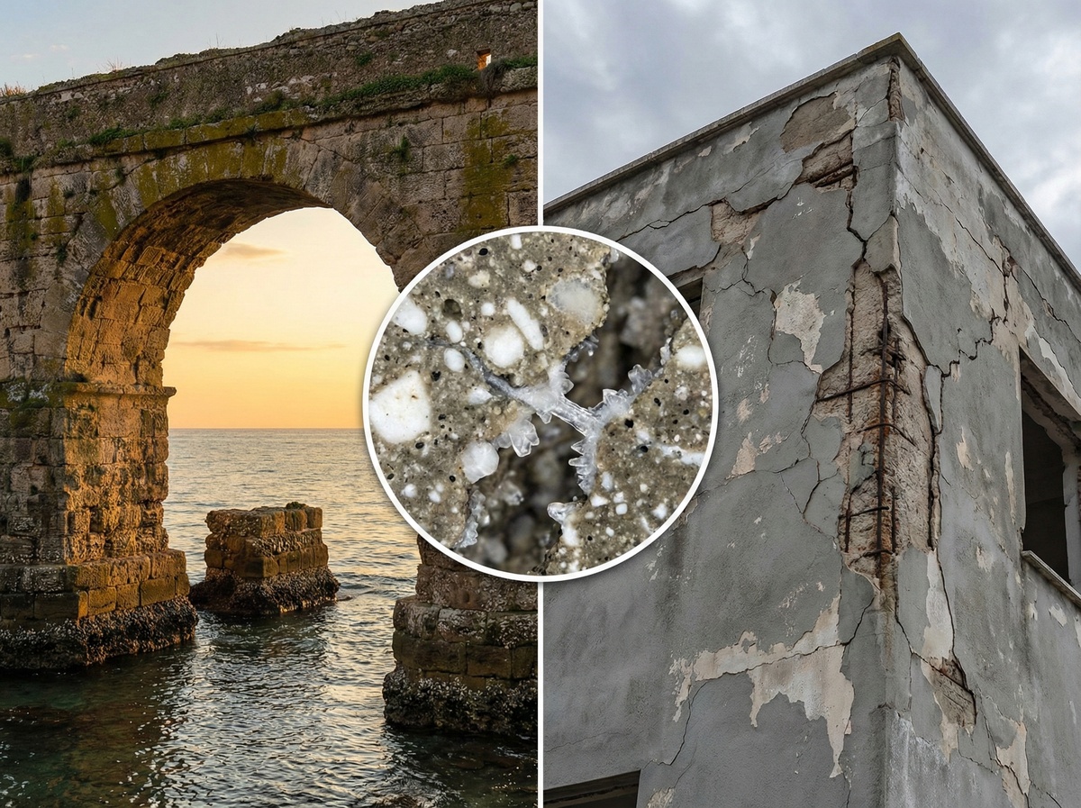 Посмотрите на римские акведуки. На Пантеон. На причалы, которые до сих пор торчат из Средиземного моря, будто их залили вчера. А теперь вспомните современную новостройку, где трещины идут уже через пару зим. Возникает неловкий вопрос: мы точно умнее древних? Или просто слишком самоуверенные. Долгое время считалось, что римлянам просто повезло с материалами. Мол, хороший песок, удачная вулканическая зола, тёплый климат. Удобное объяснение, почти успокаивающее. Но в последние годы учёные из MIT полезли глубже - буквально под микроскоп. И нашли кое-что странное. В римском бетоне обнаружили белые вкрапления извести. Раньше их считали браком, следствием плохого перемешивания. Типа халтура, не уследили. Но оказалось наоборот. Это не ошибка, а ключевой элемент технологии. Римляне сознательно использовали так называемое «горячее смешивание» - добавляли негашёную известь при высокой температуре. И бетон получался… живым. Ну, почти. Когда в таком бетоне появляется микротрещина, в дело вступает х