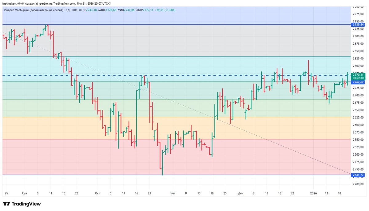 ❗️21 января российский фондовый рынок вырос, индекс МосБиржи укрепился на 1,19% до уровня 2770,53