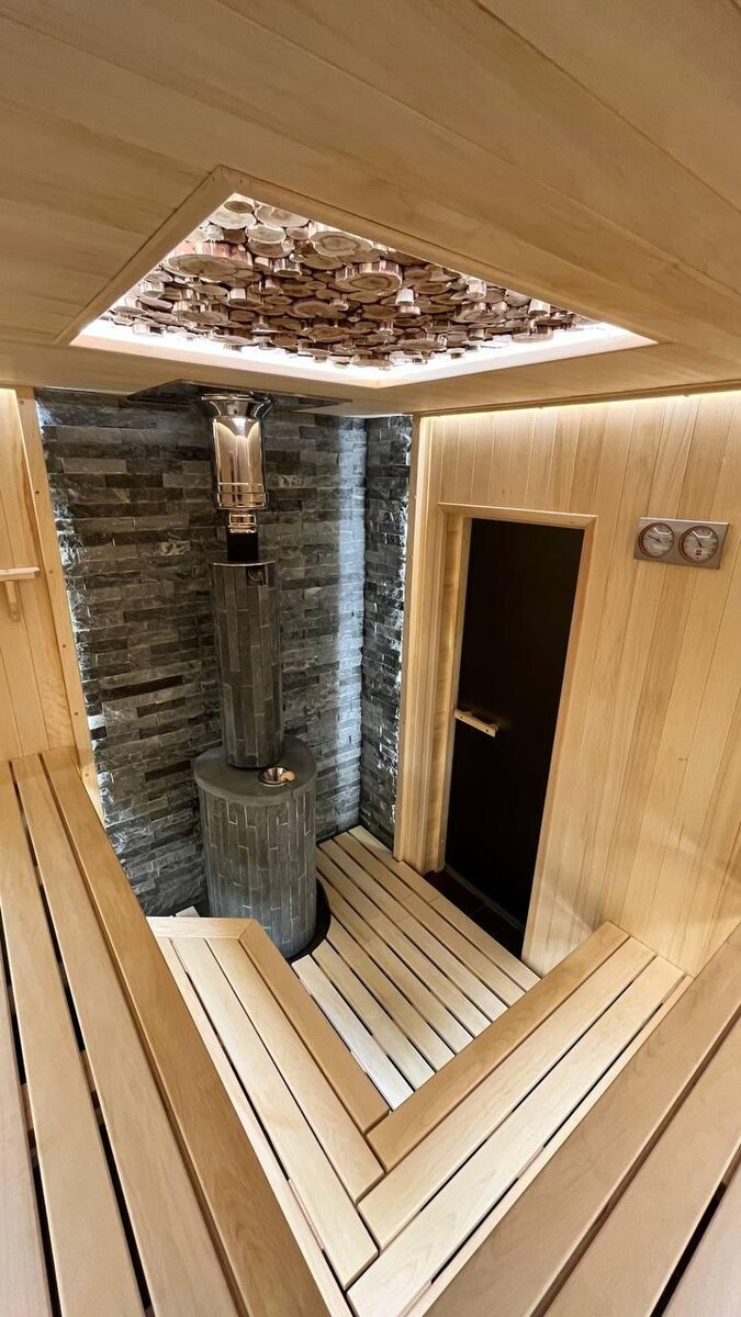 🍃 📏 Тут у нас компактные 5 м², но пространство организовали так, что 5-6 человек разместятся с комфортом. 🌳 Отделка: Выполнили всё из липы сорта «Экстра». Это идеально гладкая доска: пахнет медом, не течет смолой и, главное, не обжигает при нагреве. 🌡 Жар: Поставили печь Feringer «Малютка» в отделке из талькохлорита. Этим же камнем (в фактуре «рваный камень») выполнен фасад за ней. Талькохлорит — материал уникальный: накапливает тепло, а потом долго и плавно его отдает. 🍃 Атмосфера: На потолке — панно из можжевельника с подсветкой (аромат стоит нереальный!). Полки, потолок и фасад за печью тоже с контурной подсветкой — позволяет регулировать освещение под настроение. А под ногами — теплый пол и керамогранит с деревянным настилом. ❤️ — Если хотите такую же парную