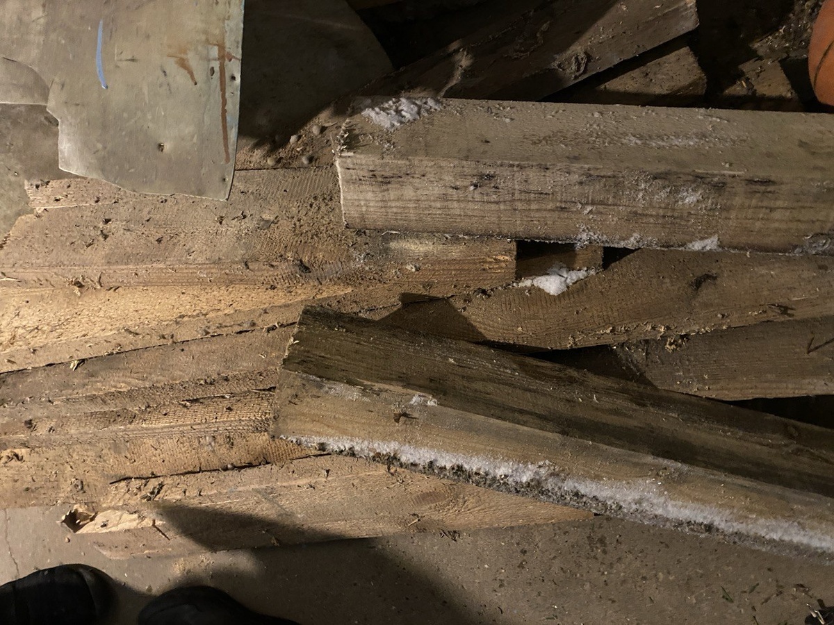 Друзья, всем привет! Продолжаем подготовку к прокладке электрики. Основная задача на сегодня для нас была - убрать "инородное тело" в виде помоста перед лестницей. Этот самый помост там появился в следствии того, что часть оригинальной лестницы сгнила, и чтобы не повторять ту конструкцию, которая была изначально, соорудили помост и на него поставили новую часть лестницы. Понятно, что для нас она никакой ценности не представляет (именно эта часть), лестницу мы будем восстанавливать в первоначальный вид, НО, этот помост мешает сделать полноценную штробу под вводной кабель. Поэтому было принято решение его сразу демонтировать, а лестницу временно поставить на подпорки, чтобы можно было попасть на мансарду. Помост разлетелся быстро, вот он уже в виде кучи старых, грилых досок Оля с царь-молотком) Внизу лесница была сшита такой вот необрезной доской, ее тоже убрали ибо там труха Дальше лестницу подняли и подставили под нее 150 брус с другой стороны на кирпичи и бруски В принципе получилось