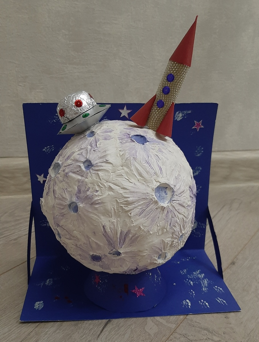 Школьная поделка на День Космонавтики. Луну (шар) можно сделать из кусочков газеты, а верхние слои смочить водой или клеем пва, чтобы форма схватилась. Внутри не стоит замачивать, иначе она не сможет просохнуть. Снаружи шара, чтобы сделать рельеф - использовать пластилин или глину, которая засыхает на воздухе, затем прорисовать красками кратеры и тени. Стоит Луна на подставке из цветного картона, как и фон, свернутого в цилиндр или чуть скошенный, как конус, только без верхушки, чтобы стоял устойчивее, т.к. сильно широкую подставку делать не хотелось. Ракета сделана из блестящего и красного картона, летающая тарелка от половинки баночки Киндера и серебристого картона. Иллюминаторы - разноцветные стразы. Сажали все с помощью клеевого пистолета, он крепче держит.