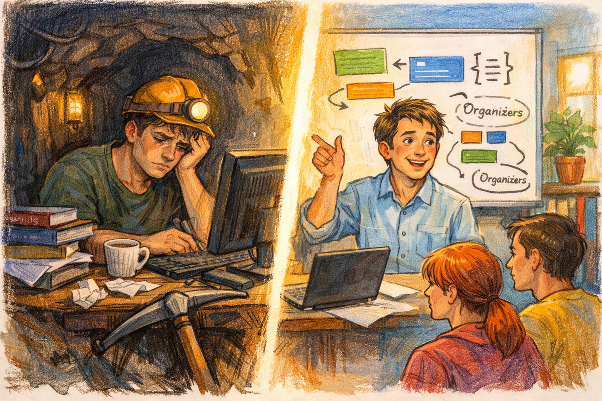 Раньше я очень хотел научиться программировать. Читал книги, решал задачи по 10 часов подряд — и всё равно ничего не понимал. Чем больше старался, тем больше застревал. Думал: наверное, я тупой. Но потом я понял: дело не в том, что я тупой. В программировании, как в спорте — если напрягать все мышцы сразу, то устаёшь быстрее, эффективность замедляется. А в долгосрочной перспективе — переутомление и проблемы со здоровьем! Даже в музыке есть подобное, например, очень многие поначалу, играя на инструменте, непроизвольно напрягают шею и плечи. А это ведёт к проблемам с кровообращением и головным болям, поэтому хороший преподаватель отучивает ученика от такого. Так что нет, нужно напрягать только то, что нужно, и ровно настолько, насколько нужно. Теперь я продолжаю изучать программирование, и за всю жизнь всё его не изучу. Но теперь я делаю это не как измученный шахтёр с ужасным начальством. Теперь я исследователь с блеском в глазах. И я вернулся в преподавание (я учитель информатики по об