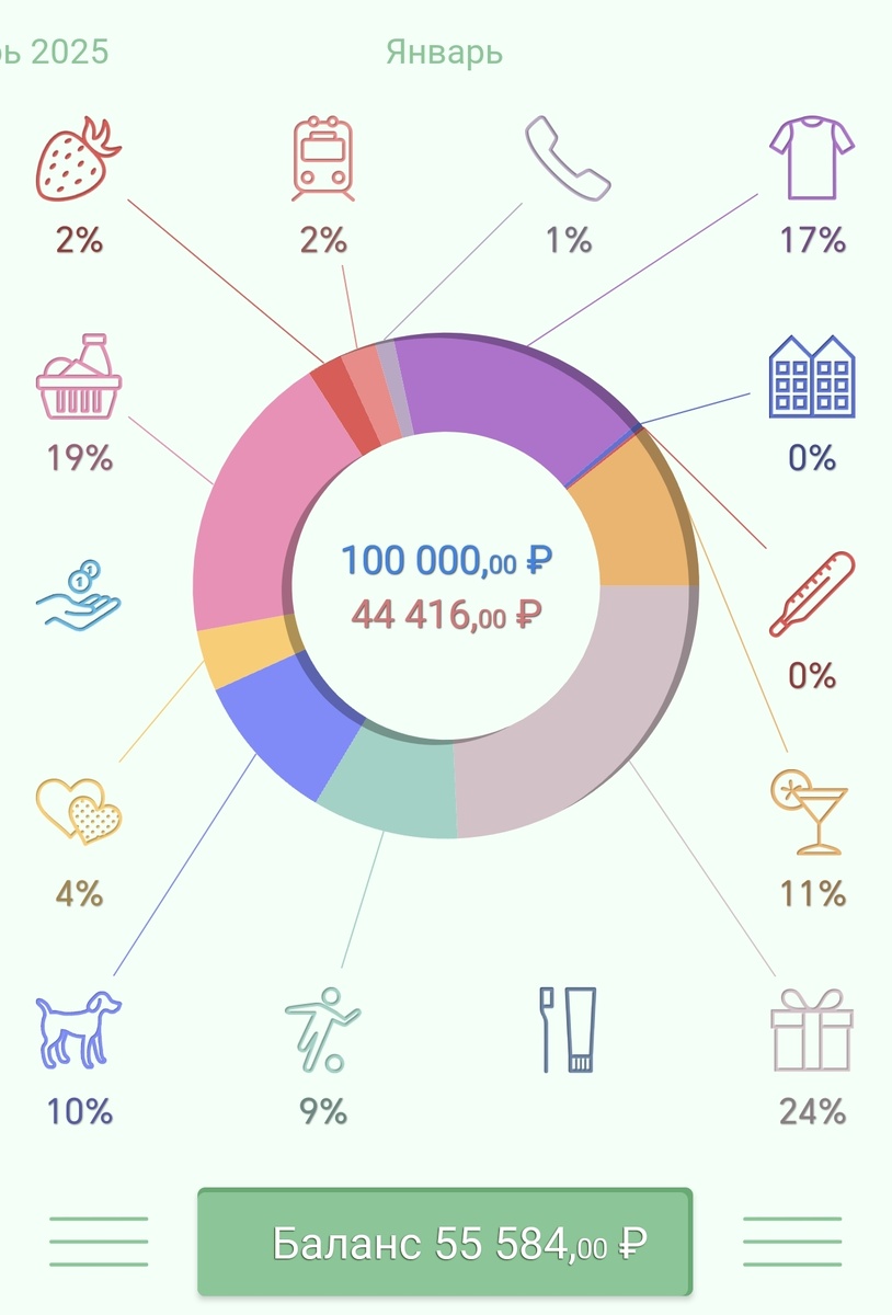 Расходы постепенно начинают увеличиваться 🤷🏻♀️, но за 21 день января потрачено меньше 50% бюджета 💪🏻:
