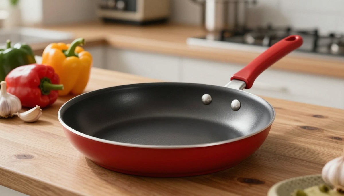 Подробное изображение сковороды Tefal Easy Plus 24 см, заметно отображаемое на переднем плане. Сковорода должна демонстрировать свою антипригарную поверхность и эргономичную ручку, подчеркивая гладкий и современный дизайн. В середине включите такую посуду, как шпатель и свежие ингредиенты, такие как овощи и яйца, что предполагает ее кулинарное использование. На заднем плане мягко освещенная кухня с теплыми тонами, добавляя уютную атмосферу. Освещение должно быть ярким, но привлекательным, подчеркивая нержавеющую сталь и черные особенности сковороды. Используйте угол крупным планом, который четко отражает спецификации сковороды, обеспечивая профессиональный внешний вид. На изображении не включены текст, логотипы или водяные знаки.