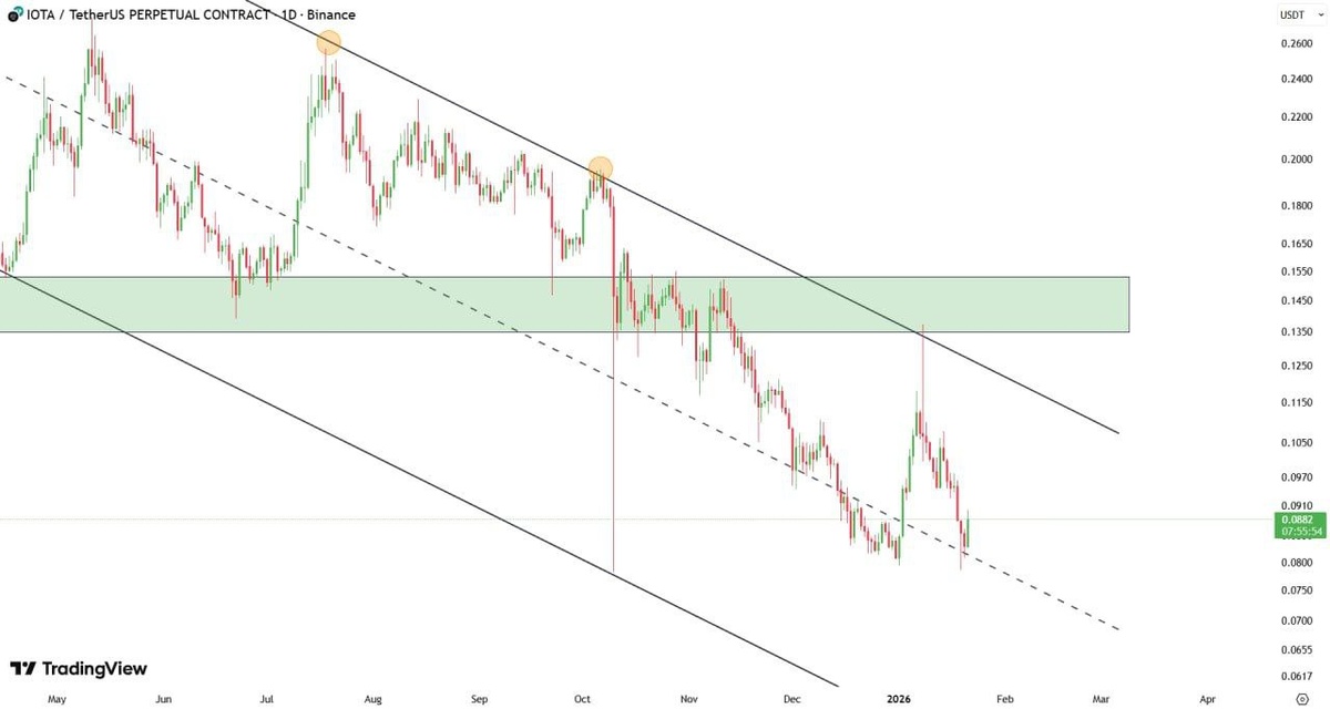 Пока IOTA в нисходящем канале, давление продавцов сохраняется. Зона $0.08–$0.075 — хорошее место для покупок. Для бычьего сценария важно пробить и закрепиться выше $0.14–$0.15. Это может сигнализировать о развороте тренда.