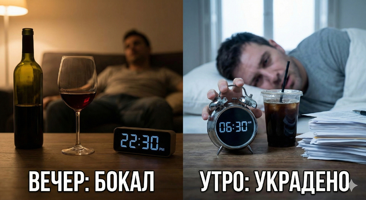 Через 4-5 часов печень переработает алкоголь. Произойдет резкий выброс адреналина (синдром отмены). Вы проснетесь в 3-4 часа ночи с колотящимся сердцем и больше не уснете нормально.