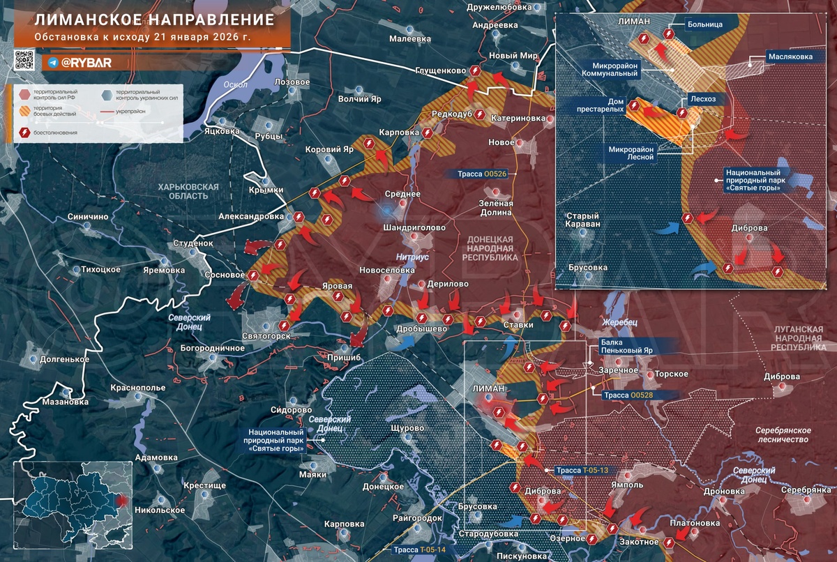 С Лиманского направления в последние недели поступает все больше сообщений о продвижении ВС РФ на подступах к одноименному городу. Наиболее ожесточенные бои идут на северо-восточной «дуге» его линии обороны. В частности, подразделения 25 армии постепенно оттесняют противника из «кармана» у Ставков и с позиций у Пенькова Яра. Контроль над сетью опорников на этом участке необходим для выхода к северным окраинам Лимана. В самом Лимане штурмовики ведут бои в окрестностях городской больницы и на опорных пунктах на трассе Лиман — Заречное. На южной и юго-западной окраинах города российским войскам, по предварительным данным, удалось зацепиться за территорию лесхоза в микрорайоне Лесной и дома престарелых. Атаки здесь направлены на обход позиций ВСУ в застройке через густой лесной массив. Вместе с тем бойцы закрепляются в Диброве и ведут бои за контроль над опорными пунктами, примыкающими к Озерному. Они являются по сути последним серьезным препятствием перед самим селом, расположенным прямо