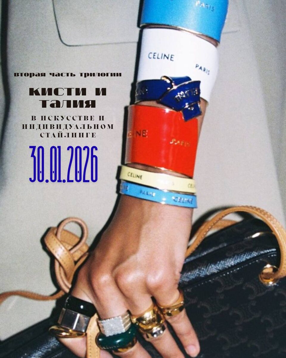 - Браслет — это не просто украшение: он может быть символом любви, дружбы, надежды, силы или веры - В истории браслеты использовали как талисман защиты от негативной энергии или злых духов - В одних культурах браслеты означали статус и богатство, а в других — духовную связь с богами или предками - Браслеты с подвесками — это маленькие истории и вехи жизни, где каждая подвеска может быть напоминанием о важном событии или человеке - Цвет и материал браслета тоже несут смысл: например, золотой — богатство и любовь, серебряный — чистота и ясность, натуральные камни — защитные и терапевтические свойства 💫 Именно об этом — и гораздо шире — мы будем говорить на лекции № 2 нашей трилогии «Оформление талии, бёдер и кистей рук в искусстве и индивидуальном стайлинге» Мы продолжим разговор о теле как о художественной композиции и разберём: — сумки как визуальный якорь образа — кольца и их влияние на пропорции и характер руки — маникюр как часть жеста и визуального впечатления — жесты рук и их