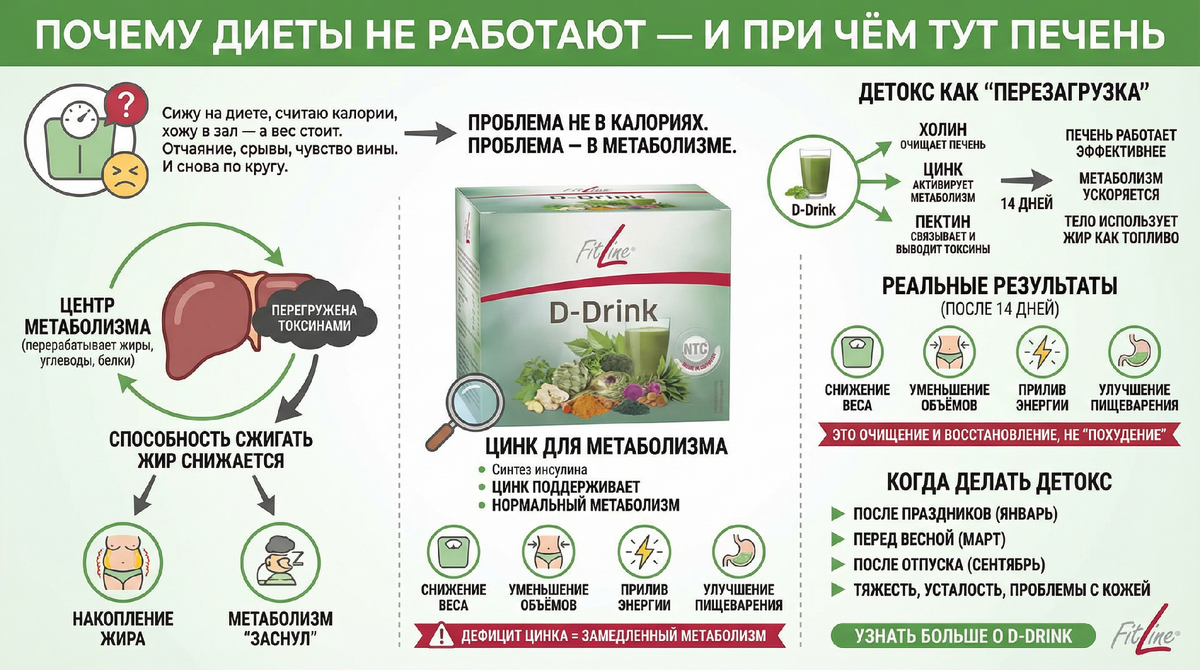 История, которую слышали многие: "Сижу на диете, считаю калории, хожу в зал — а вес стоит". Отчаяние, срывы, чувство вины. И снова по кругу. Проблема часто не в калориях. Проблема — в метаболизме. А метаболизм напрямую связан с печенью. Печень — это центр метаболизма. Она перерабатывает жиры, углеводы, белки. Когда печень перегружена токсинами, её способность сжигать жир снижается. Вместо того чтобы использовать жир как топливо, организм начинает его накапливать. Калории урезаны, но вес не уходит — метаболизм "заснул". В каталоге FitLine чётко написано: цинк поддерживает нормальный метаболизм. Цинк участвует в сотнях биохимических реакций, включая: Дефицит цинка = замедленный метаболизм. И никакие диеты не помогут, пока дефицит не восполнен. D-Drink работает комплексно: Через 14 дней печень начинает работать эффективнее. Метаболизм ускоряется. Тело начинает использовать жир как топливо. После 14-дневной программы D-Drink многие отмечают: Это не "похудение на диете". Это очищение и вос