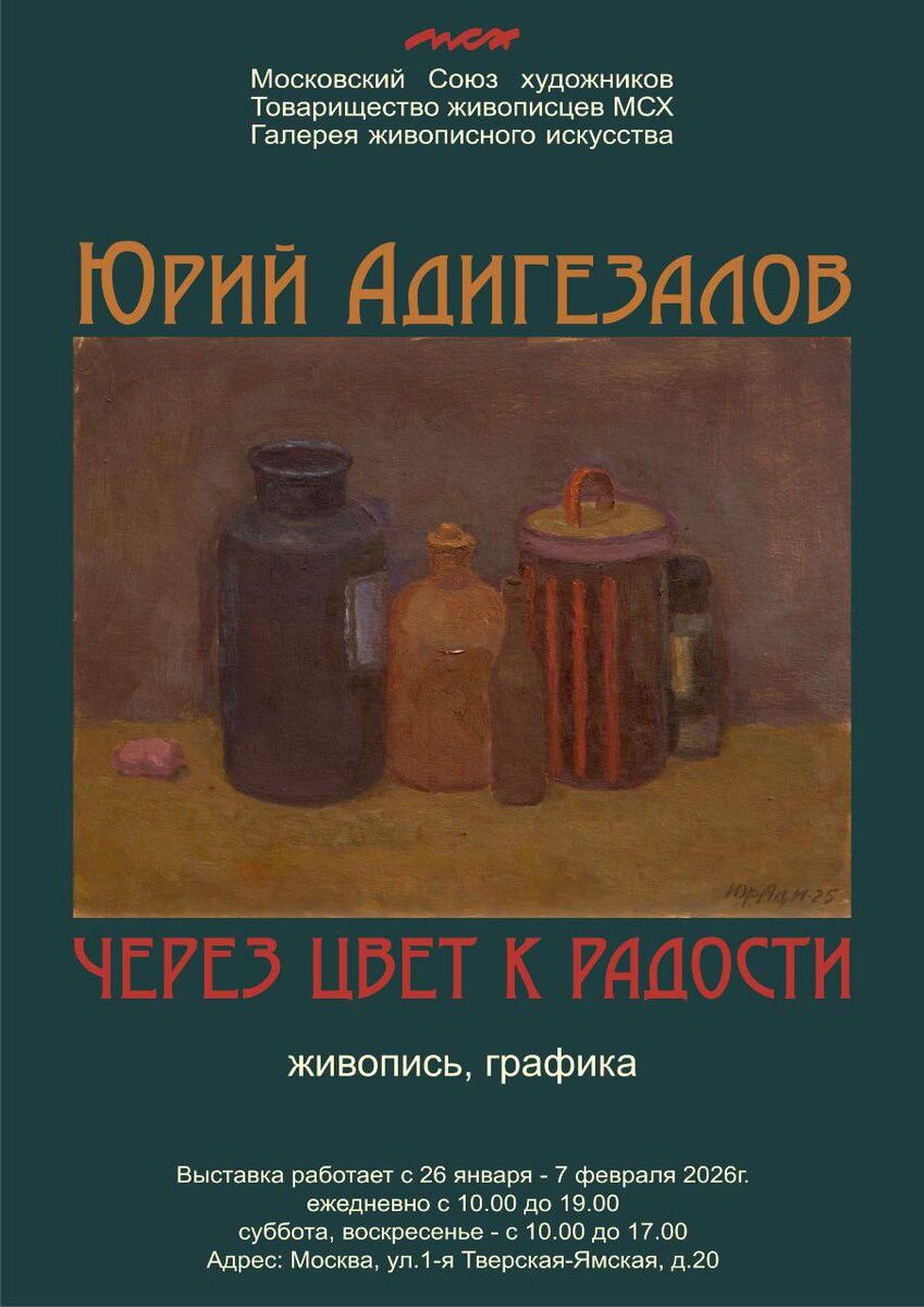 » С 26 января в зале на 1-й Тверской-Ямской открывается персональная выставка мастера, чья жизнь неразрывно связана с театром. Проработав в мастерских Большого театра и «Современника», Юрий Адигезалов перенес сценическую магию на свои холсты. Для него предметы в натюрморте — это актеры. Приглашаем вас увидеть этот «тихий театр» и почувствовать путь к радости через цвет. 🗓 Когда: 26 января — 7 февраля 2026 📍 Где: 1-я Тверская-Ямская, 20 (Выставочный зал МСХ) ✨ Открытие: 26 января в 17:00 (вход по приглашениям) в остальные дни работы выставки, посещение свободное.