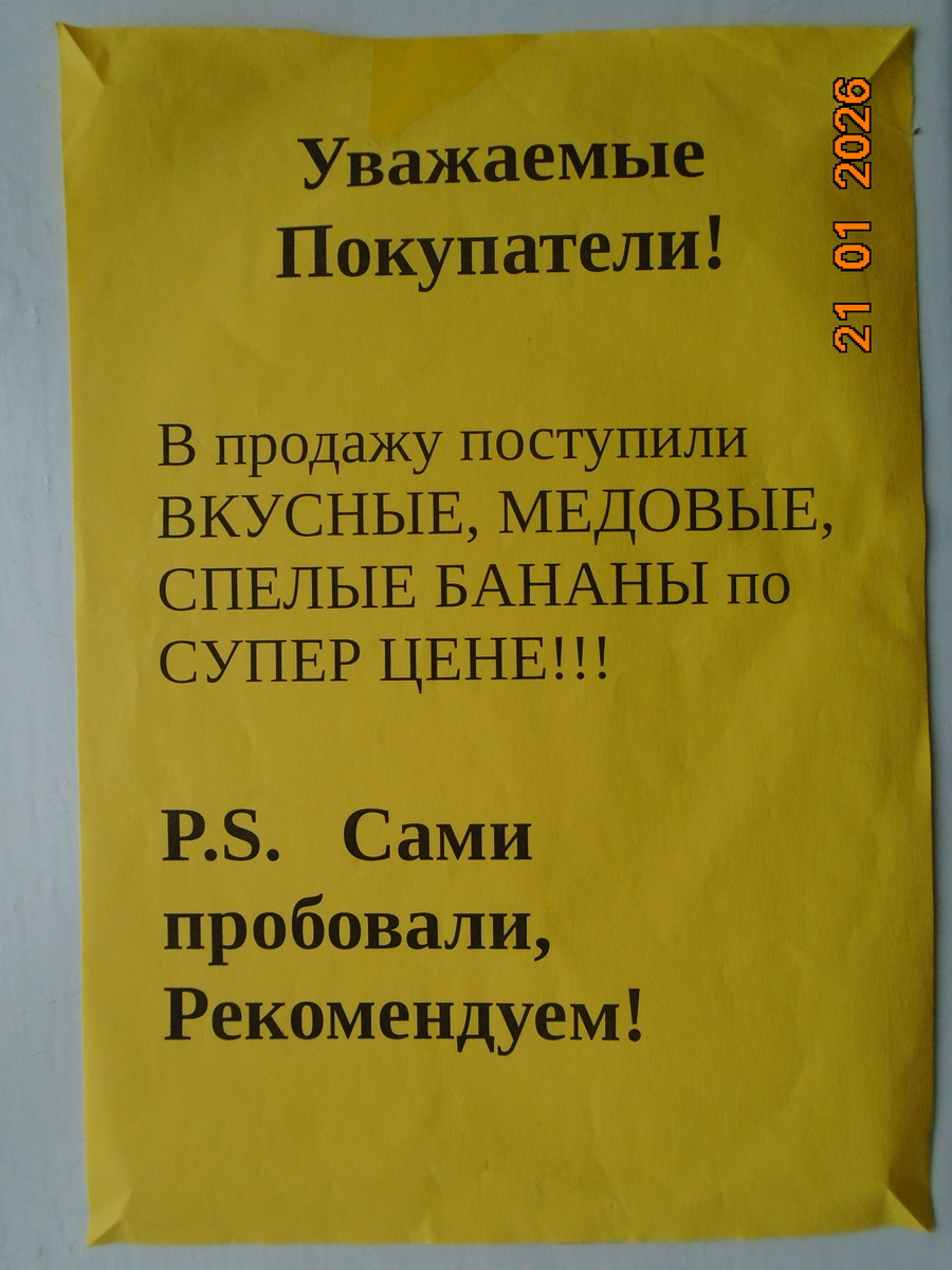 Нужно ли доверять вкусу продавца? Самый частый вопрос от покупателей в столице Золотого кольца? - Какая водка, мальчики, получше? - Мандарины с косточками? - Апельсины пробовали? Сладкие? - Арбузы красные? - Дыни никто не возвращал? Мы, продавцы и кассиры, разводим руками и диву даемся. А покупатели: - Вы же, наверно, проверяли? - Нет! Покупатели всё-таки не верят нам! В одном из магазинов в столице Золотого кольца я встретил это объявление (орфографию сохраняю). См. фото. О чем думает Федя Ухов, бывш. кассир и продавец? - Преисполненные добрых чувств, продавцы магазина сделали шаг навстречу простоватым и бесхитростным покупателям, в чьих головах живет лишь один вопрос, когда они видят желтые фрукты: «Сладкие ли бананы?» Но до грамотной работы с покупателями этому магазину далеко! О цене, о скидках ни слова! Цена бананов превышает или нет стоимость бананов в других магазинах? Хватит ли бананов на всех? Всё человек должен знать, чтобы эффективно использовать свои денежные средства. Допу