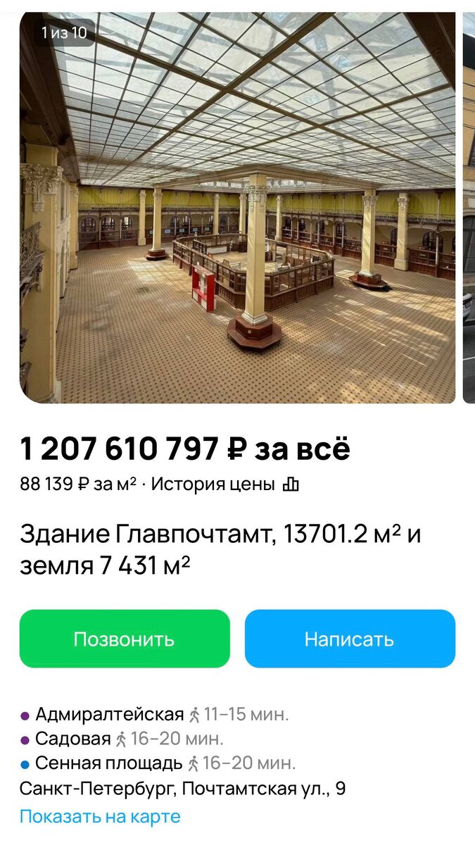 Большой исторический объект в центре Петербурга как будто бы должен иметь судьбу посолиднее. На деле же Главпочтамт уже несколько лет ходит по кругу, а его судьба выглядит как череда несбывшихся проектов. Исторический комплекс на Почтамтской улице, 9 предлагают купить за примерно 1,2 млрд рублей, объявление появилось в базе Российского аукционного дома и на «Авито». В продаже весь имущественный комплекс - трехэтажное здание площадью 13,7 тыс. кв. м и земельный участок на 7,4 тыс. кв. м в квартале между Почтамтской улицей, Почтамтским переулком и улицей Якубовича. Аукцион назначен на конец этого месяца, заявки принимаются до 26 января. Это уже вторая попытка продать объект. Впервые Главпочтамт выставили на торги в конце ноября 2025 года, но спустя несколько дней процедуру отменили без объяснений. В декабре здание снова вернули в продажу с той же стартовой ценой. В «Почте России» называют его непрофильным активом, не планируют дальнейшее использование и считают реставрацию экономически н
