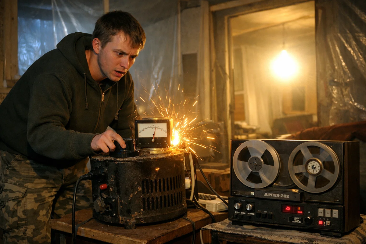 Зима в том районе всегда сопровождалась проблемами с электричеством. Напряжение в сети скакало, как пульс больного лихорадкой. Лампочки то тлели багровым светом, то едва светились. Для спасения техники мы использовали старый тяжелый ЛАТР (лабораторный автотрансформатор) — массивный прибор с большой круглой ручкой сверху. Именно он питал мой досуг: старый телевизор и пару ламп.