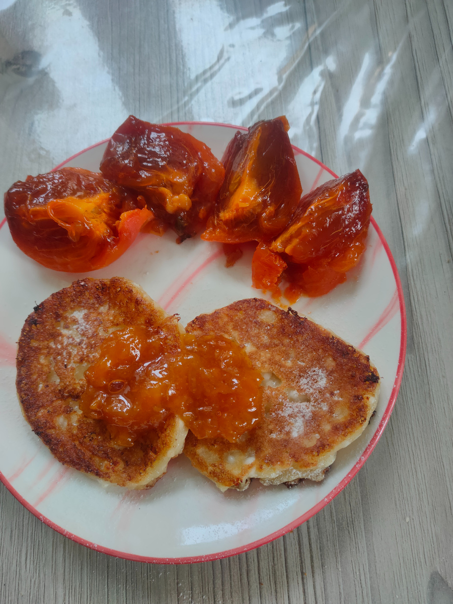 Добрый день, мои подписчики и гости моего канала. Пусть утро начинается с улыбки, с хороших нежных самых добрых слов! Пусть будет небо ясное над вами, а сердце греют счастье и любовь! Я рада вас видеть на своем канале. К нам снова вернулись морозы до - 25 и ниже. Несмотря на морозы снег не обошел нас стороной. Выпало даже больше обычного. После завтрака опять придется браться за лопату, пока свежий и легкий. За завтрак испекла оладушки из творога, в творожные оладьи я обязательно кладу яйцо. Итак, завтрак: оладушки из творога, ела из с абрикосовым джемом + порезала хурму, заварила черный кофе, пила его с ломтиками сыра и конфетой. Творог у меня остался, сделаю к чаю творожные шарики. Завела тесто, положила его в холодильник, пусть отдыхает, пока я буду убирать снег. На улице морозно, но за работой совсем не чувствуется холода, а вот Бобби моментально замерзает, немного и бежит домой, а потом опять просится на улицу. Скинула снег с теплицы см 4 толщина. На уборку снега ушло 1,5 часа.