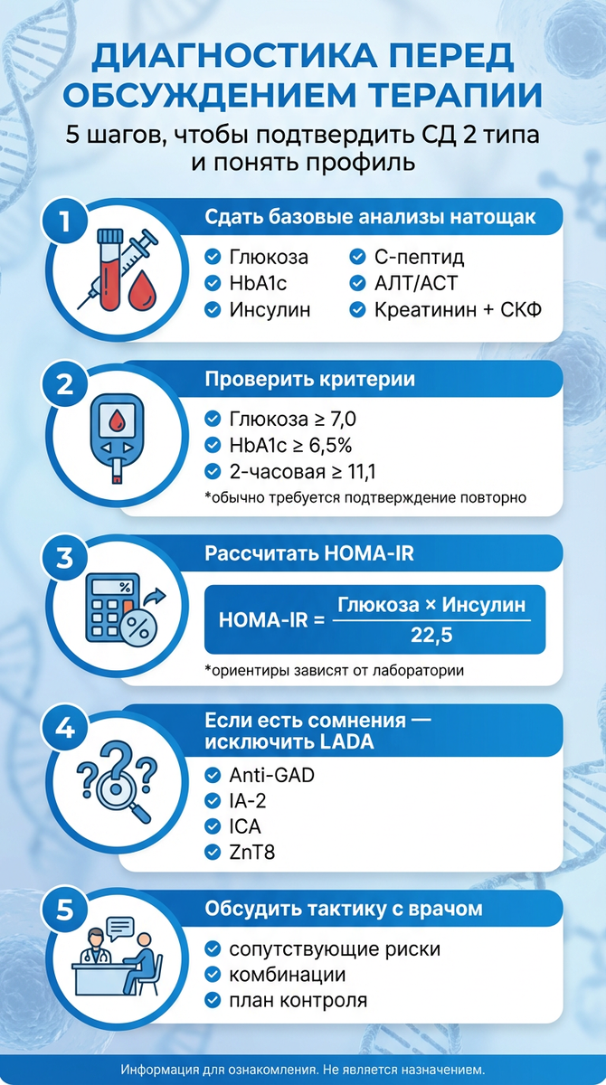 Ключевые SEO‑запросы: диабет 2 типа анализы, HbA1c 6.5, глюкоза натощак 7.0, HOMA‑IR, инсулинорезистентность, С‑пептид, LADA, антитела GAD, дорзаглиатин, HuaTangNing, диагностика диабета.