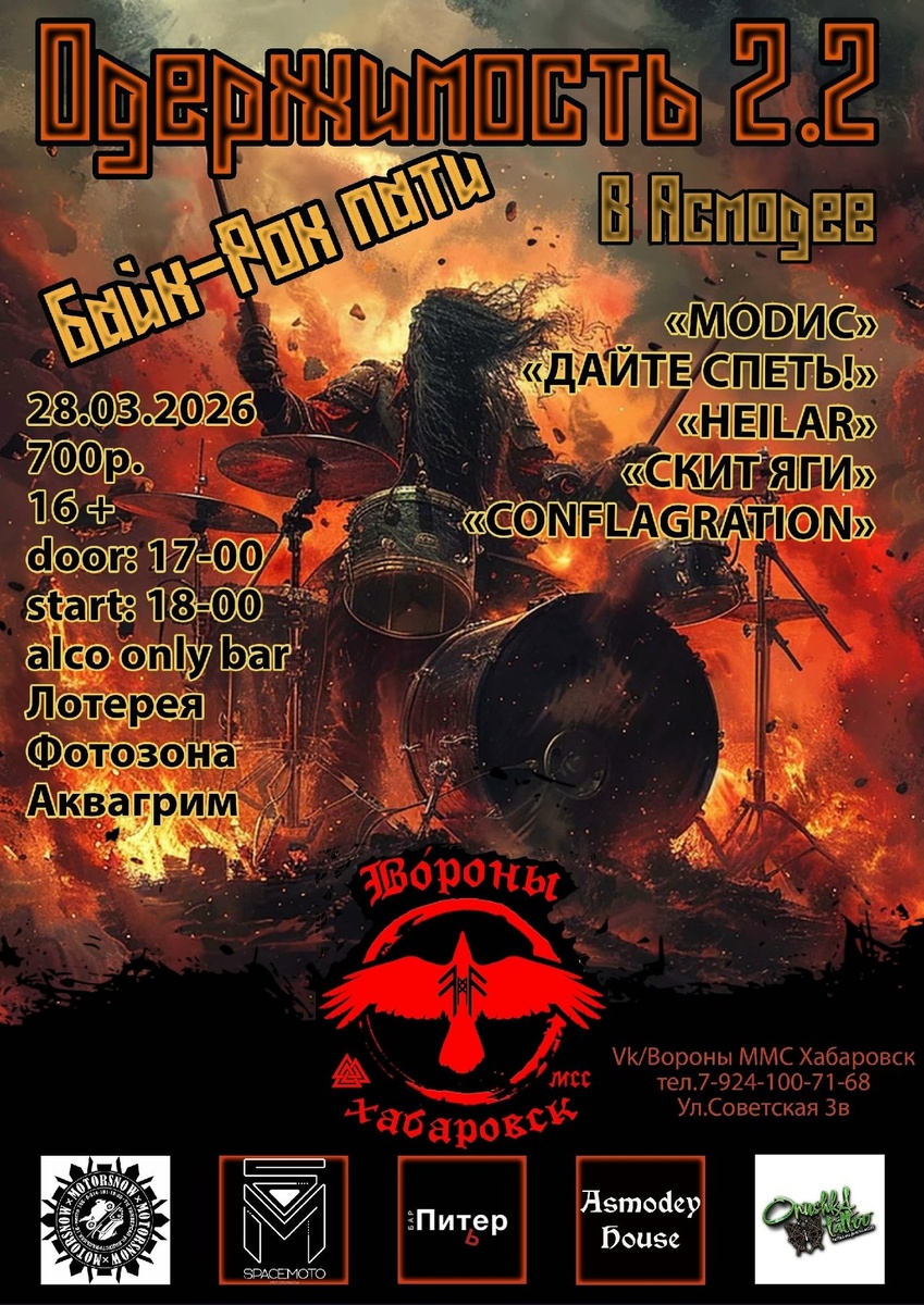 Байк-рок пати Одержимость 2.2 в Асмодее 2026 (Хабаровск) Мотофесты RSS А вот и подробности Весенней Одержимости! В программе: «Модис»; «Дайте спеть!»; «Heilar»; «Скит Яги»; «Conflagration». А также: лотерея; фотозона; аквагрим. Двери в 17:00. Начало в 18:00. Экосбор: 700 р. Ждём с нетерпением! 16+ Состоится: 28.03.2026 Координаты: 48.485985, 135.048797 Место проведения: Хабаровск #Хабаровск #Мотофесты @motofesty