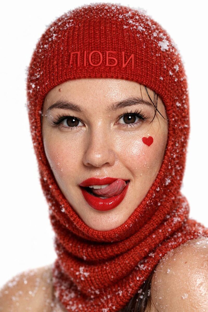 ? 😁 1. От чата GPT 2. От Nano Banana ❤️ Промт к 14 февраля поиграться: Создай портрет, на меняя черты лица. Портрет девушки , не лицо , обрамлённо в вязаную шапку-балаклаву насыщенно -красного цвета, которая обволакивает голову и шею. На шапке выбито слово «ЛЮБИ», выполненное вышивкой в тон основной ткани. На щеке женщины небольшое красное сердечко. Влага также заметно играет на лице — капли воды и снежинки украшают ресницы, брови и некоторые участки волос, которые слегка выбиваются из-под шапки. Лицо женщины повернуто строго в камеру, взгляд сфокусирован вперёд с лёгкой игривой улыбкой, подчёркнутой приоткрытым ртом и языком, касающимся верхней губы. Губы пухлые насыщенно красные , идеально накрашенные.Тон кожи ровный и теплый, с лёгким здоровым блеском, подчеркивающим мягкость черт. волосы видны лишь частично у нижнего края шапки, слегка засыпанные снежинками и каплями воды, Фон абсолютно белый, дающий максимальный контраст, Свет яркий и направленный, отбрасывающий мягкие тени и
