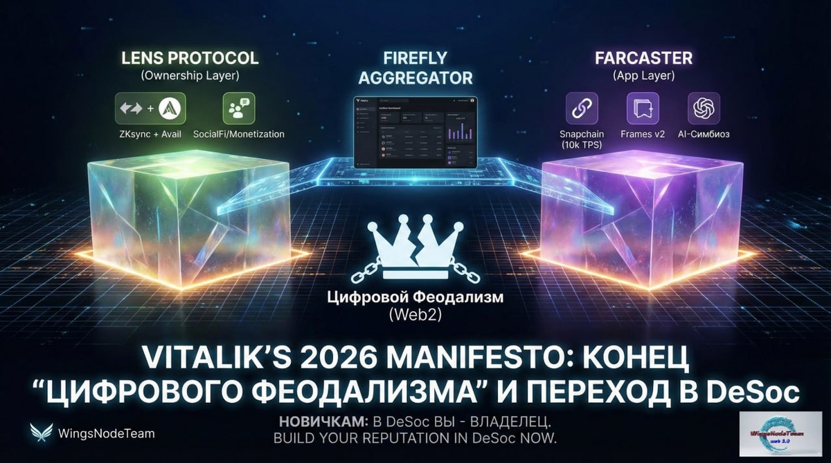 Виталик Бутерин сделал программное заявление: 2026 год станет годом его полноценного возвращения в децентрализованные соцсети (DeSoc). Это не просто личное предпочтение основателя Ethereum. Это рыночный сигнал. Когда главный визионер индустрии говорит, что Web2-платформы (Twitter/X) превратились в "информационную зону боевых действий", и призывает мигрировать на Lens и Farcaster - умные деньги начинают смотреть на инфраструктуру этих протоколов. Разбираем👇👇👇, что изменилось в 2026 году и где здесь возможности для вас. 🤺 Битва Протоколов: Lens vs Farcaster Рынок DeSoc больше не "сырой". Мы видим два разных подхода к будущему общения: 1️⃣ Lens Protocol (The "Ownership" Layer) 🔵Новость: Виталик похвалил команду Aave, но сейчас управлением Lens занимается Mask Network. Это стратегический сдвиг. 🔵Технологии: Переход на Lens Chain (стек ZKsync + Avail) решил проблему дорогих транзакций. Теперь каждое ваше действие (лайк, шер) - это транзакция, но она стоит копейки и подтверждает