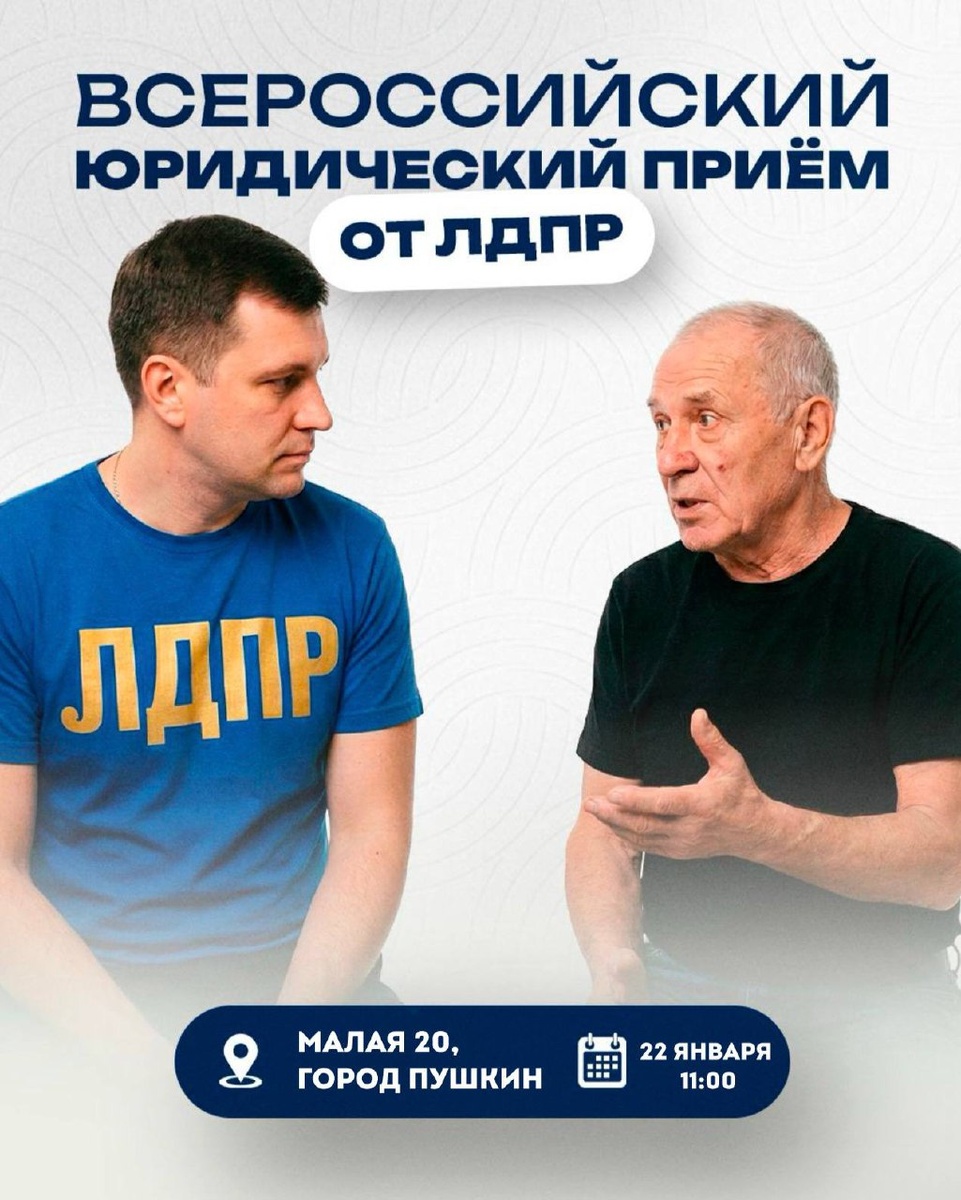 Санкт-Петербургское региональное отделение ЛДПР приглашает жителей Пушкина и всего Петербурга на Всероссийский юридический приём. 🗓 22 января ⏰ Начало в 11:00 📍 г. Пушкин, ул. Малая 20 На приёме вы сможете: • получить бесплатную юридическую консультацию, • задать вопросы по защите своих прав и законных интересов, • получить разъяснения по социальным, жилищным, трудовым и другим правовым вопросам. 📩 Запись обязательна - через личные сообщения: @Mldprr Контактное лицо для записи: Матвей Повякало. ЛДПР - за справедливость и защиту прав граждан! Ждём вас! 🔗 Мы ВКонтакте 🖥 Сайт ЛДПР | Санкт-Петербург