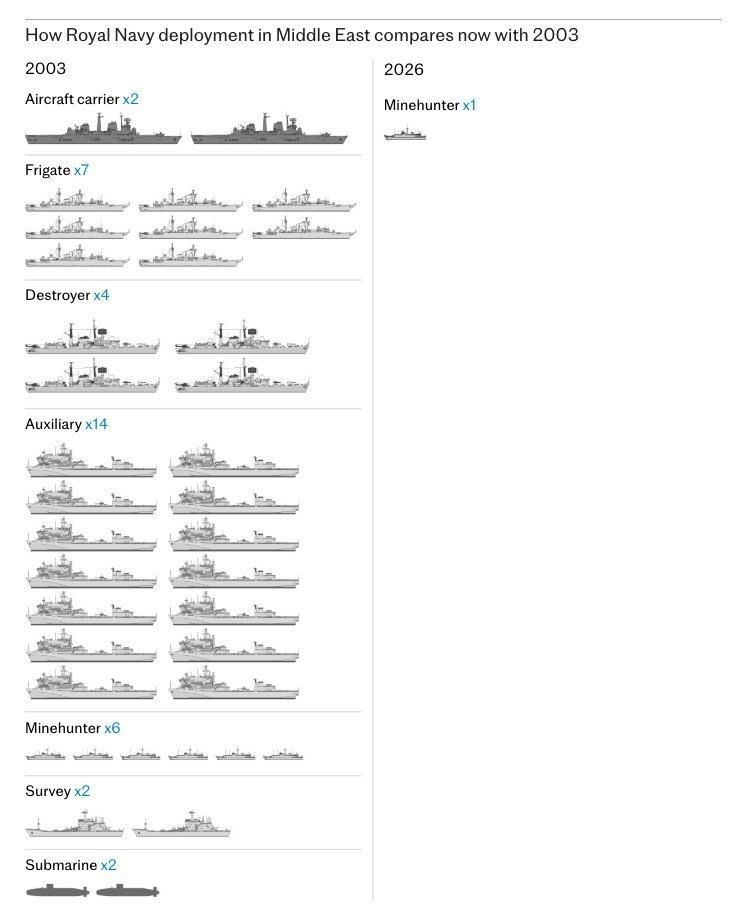 Военно-морской флот Британии на примере присутствия королевских ВМС в регионе Ближнего Востока в январе 2003 года и в январе 2026 года