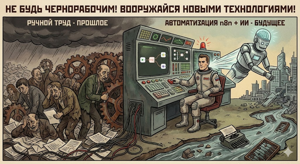 Мир не такой простой. Чтобы выжить, ты должен стать гибридом: человеком, который держит руку на кнопке «Execute Workflow». Не будь тем, кто плывет по течению. Вооружайся. Разворачивай свой n8n, подключай к нему «мозги» и становись тем, кто диктует условия, а не тем, кого сокращают.