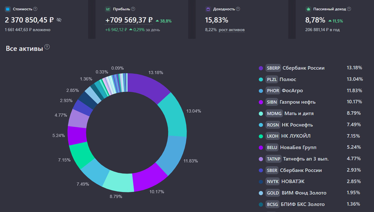Прибыль моего портфеля за все время моего инвестирования составляет 709 629 (+38,7%) ₽. Такой результат получился за счет регулярных еженедельных покупок, как на хаях, так и на низах, в итоге получалось что-то среднее. Если бы обладал хрустальным шаром, тогда бы бабушка была бы дедушкой.