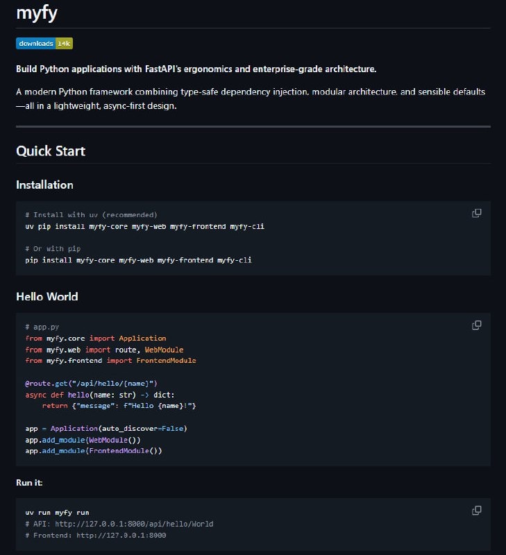 π myfy β ΡΡΠΎ ΡΠΎΠ²ΡΠ΅ΠΌΠ΅Π½Π½ΡΠΉ Python-ΡΡΠ΅ΠΉΠΌΠ²ΠΎΡΠΊ Ρ ΠΌΠΎΠ΄ΡΠ»ΡΠ½ΠΎΠΉ Π°ΡΡ ΠΈΡΠ΅ΠΊΡΡΡΠΎΠΉ, ΠΎΡΠΈΠ΅Π½ΡΠΈΡΠΎΠ²Π°Π½Π½ΡΠΉ Π½Π° ΡΠ°Π·ΡΠ°Π±ΠΎΡΠΊΡ Π²Π΅Π±-ΠΏΡΠΈΠ»ΠΎΠΆΠ΅Π½ΠΈΠΉ Ρ ΡΠ΄ΠΎΠ±Π½ΠΎΠΉ ΠΎΡΠ³Π°Π½ΠΈΠ·Π°ΡΠΈΠ΅ΠΉ
