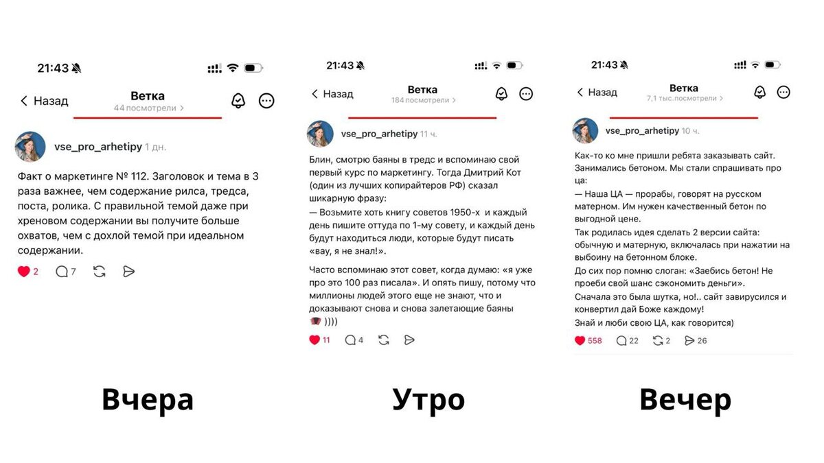 часов. Ситуация: я перешла на чисто экспертные темы в тредс, пишу четко про маркетинг. Вчера у постов по 1-2 просмотра за час, по 1-2 лайка за сутки: я и мой друг. Состояние: да ну его нахрен, у маркетологов тут вообще фигово посты заходят. По 10-15 лайков супер, больше 100 лайков — да ты топ! Но я опытный боец. Я знаю, что в тредс есть моя ца, я знаю, что к любой аудитории можно подобрать ключик. А еще я знаю, что очень важно Состояние. Так что вчера сидела и перенастраивалась. Сегодня выкладываю с утра тредс, и он набрает 182 просмотра и 10 лайков, я прям обрадовалась! Сижу, думаю: может будут у меня и экспертные ветки набирать, и будут когда-нибудь на них и 100 лайков, и 300. Выложила еще несколько постов… и история из моей бизнес-практики набирает 7000 просмотров и 550 лайков и продолжает лететь дальше! И подписки идут, хотя я уже не ждала особо. Так бывает и с деньгами, и подписчиками, и много с чем еще в жизни. Сегодня ты можешь быть в 🍑, но через час, день, неделю — в