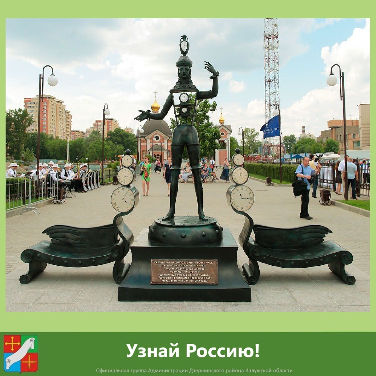 "! Правильный ответ на прошлый вопрос – город Боровск. А теперь новое задание. Шутливая скульптура «Человек-часы» установлена в парке Солнечных часов. Центральное место в композиции занимает человеческая фигура, в которую вставлены всевозможные часы. На голове персонажа - часы с протёкшим циферблатом - отсылка к стекающим часам Сальвадора Дали. В скульптуру вставлены два будильника и песочные часы. По бокам от фигуры — две скамейки, которые изображают летящих полуангелов, вместо голов у которых тоже часы. Памятник выполнен в бронзе и граните в стиле французского гротеска XVII века. Автор памятника — скульптор Михаил Шемякин. Скульптура несёт в себе глубокий смысл и заставляет задуматься о таком сложном явлении, как Время, о его быстром и непрерывном течении, о его зыбкости.
