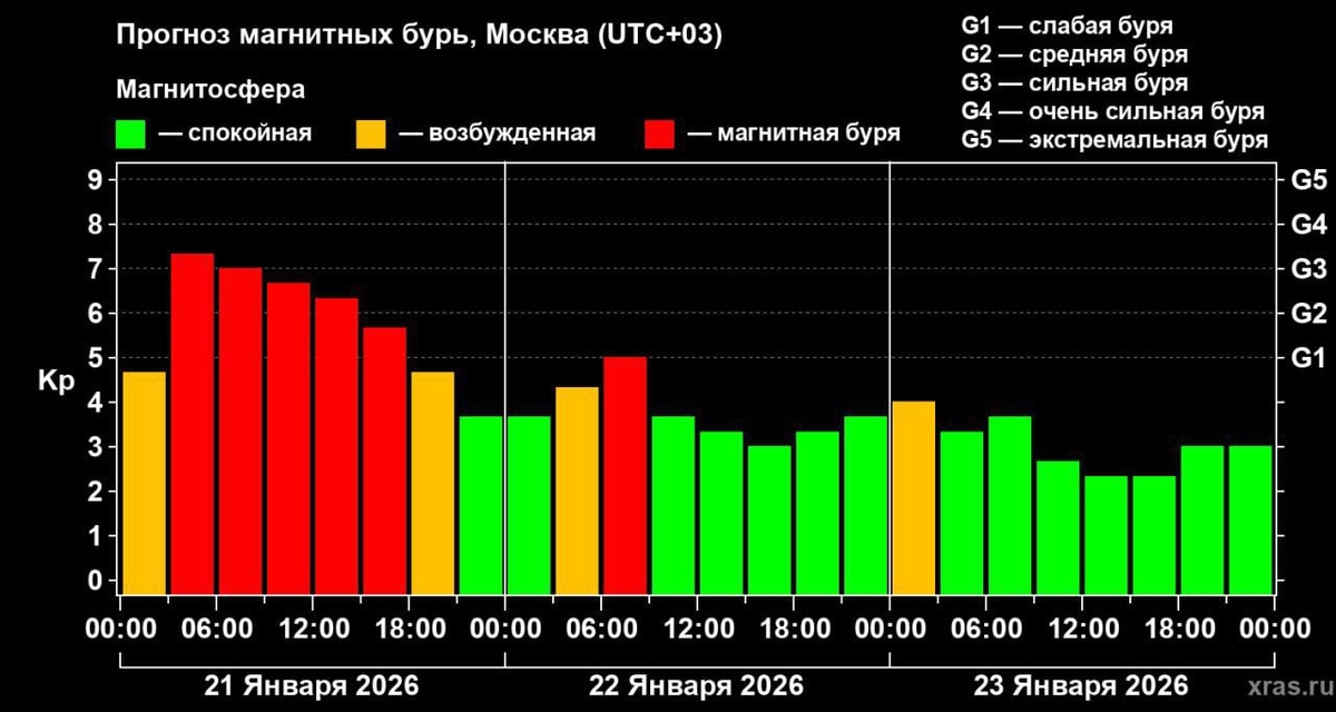 Продолжавшаяся около 42 часов магнитная буря завершилась. После 15 часов по московскому времени возмущения геомагнитного поля ослабели, и индекс Kp, отражающий величину этих возмущений опустился ниже отметки в 5 единиц, которая и является нижней границей магнитной бури. К настоящему времени геомагнитное поле вернулось в "зелёную зону" и находится в неустойчивом состоянии. Центр ФОБОС 📲 «Мой Реутов» в MAX