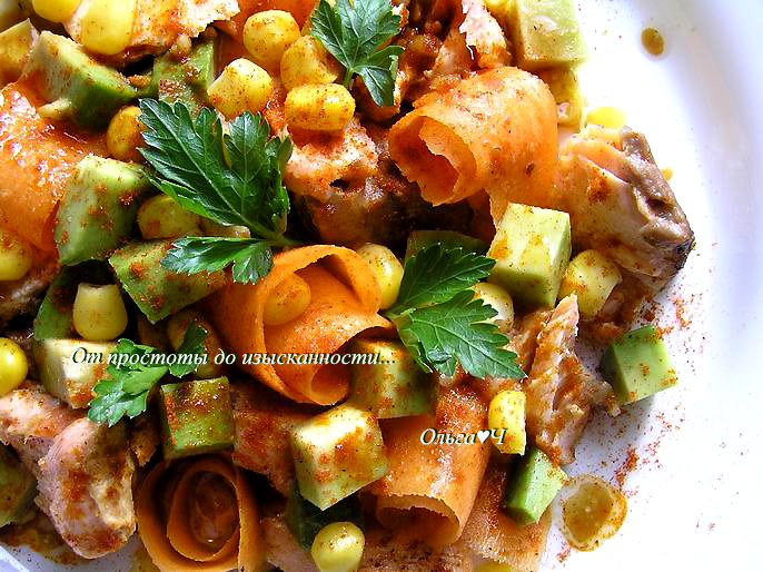 2 ст. л. оливкового масла Приготовление: Смешайте все ингредиенты для заправки-маринада кроме горчицы. В половине приготовленной смеси замаринуйте лосося на 20 минут. В оставшуюся часть заправки-маринада добавить горчицу и перемешайте. Стейк лосося обжарьте на сухой сковороде-гриль по 4-5 минут с каждой стороны (смотрите по толщине) до готовности. На тарелки выложите кусочки приготовленного лосося, разобранного на кусочки, и морковь, нарезанную тонкими пластинами с помощью овощечистки, и завернутую в колечки . Добавьте авокадо, нарезанное кубиками, и кукурузу. Полейте салат заправкой, посыпьте паприкой, украсьте петрушк