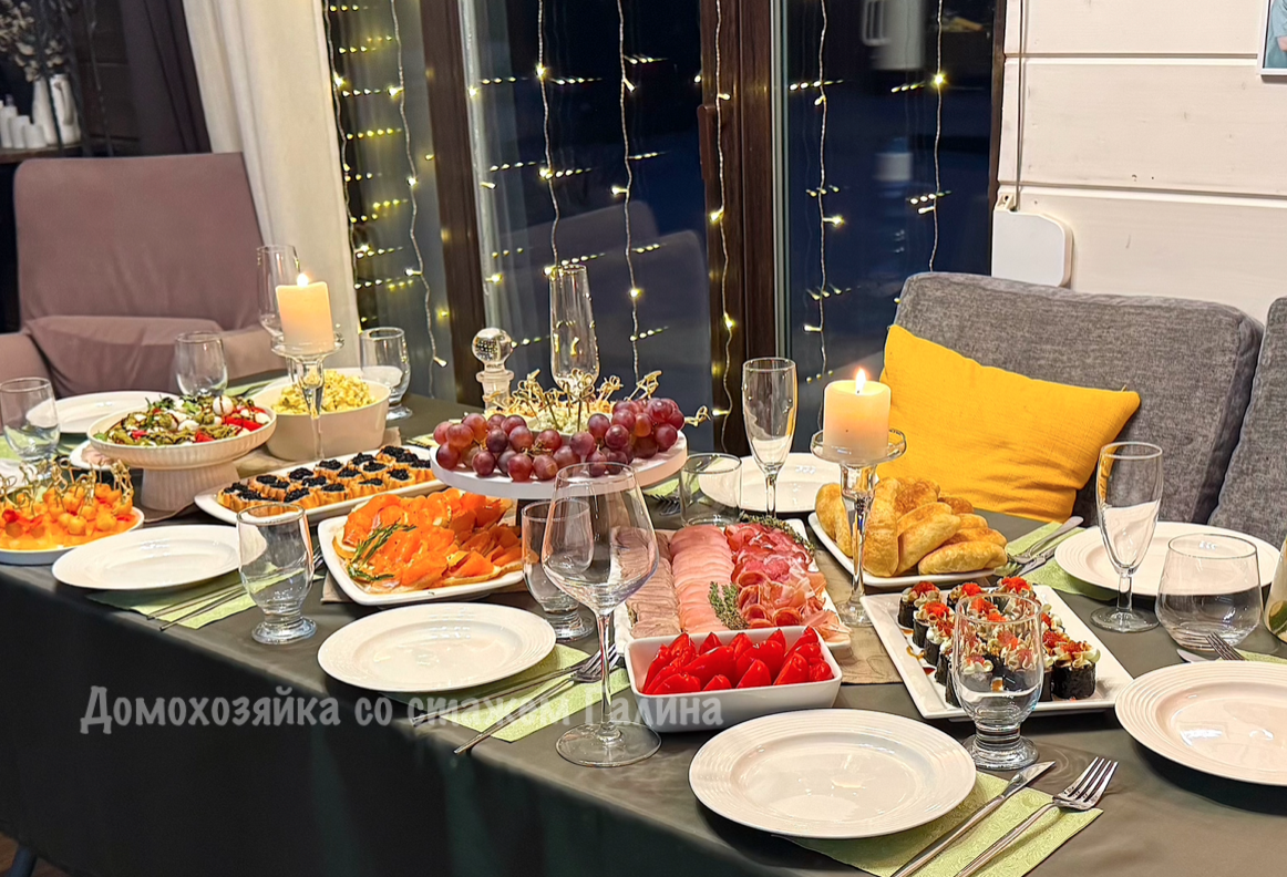 Судя по вашим комментариям в этом посте, вы с удовольствием смотрите мои обзоры праздничных столов, и я с радостью делюсь новым! Честно признаюсь, сама обожаю смотреть ваши праздничные столы, когда мы заглядываем друг к другу на огонёк, любуемся сервировкой, вдохновляемся идеями и просто делимся теплом. Этот стол был накрыт на день рождения мужа. К сожалению, собраться всей семьёй не получилось, кто-то подхватил простуду и остался дома. Но мы ни в коем случае не оставили их без внимания, аккуратно упаковали угощения и отправили прямо к ним. Пусть праздник будет, даже если за отдельным столом ❤️. А теперь покажу, что приготовила для нашего домашнего торжества… Это один из тех салатов, который никогда не остается. Так что смело готовьте с запасом. Состав: помидоры, моцарелла, рукола, соус песто, бальзамический соус, соль и свежемолотый перец по вкусу Иногда думаю, а вдруг кто-то скажет — это «не наша» еда? Но я за разнообразие. Мне кажется, здорово, когда на